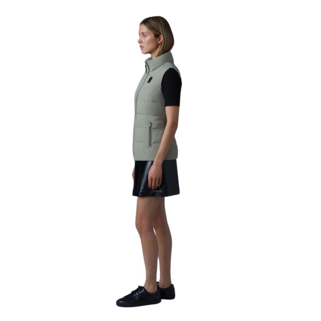 The Mackage Gisela Stretch Light Down Vest with Stand Collar is a sustainable, ultra-light down vest with a sleek stand collar, designed for a fitted silhouette. Its channel-quilted shell features a subtle stretch, allowing for easy movement. The flawless panel construction and an elastic waist back insert accentuate the cinched look, making it a stylish mid-season layering piece.
