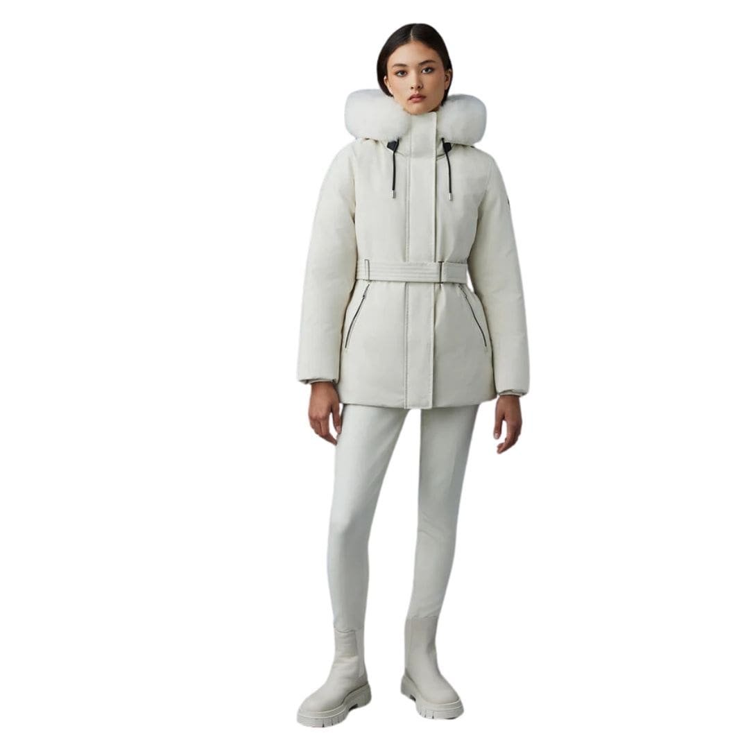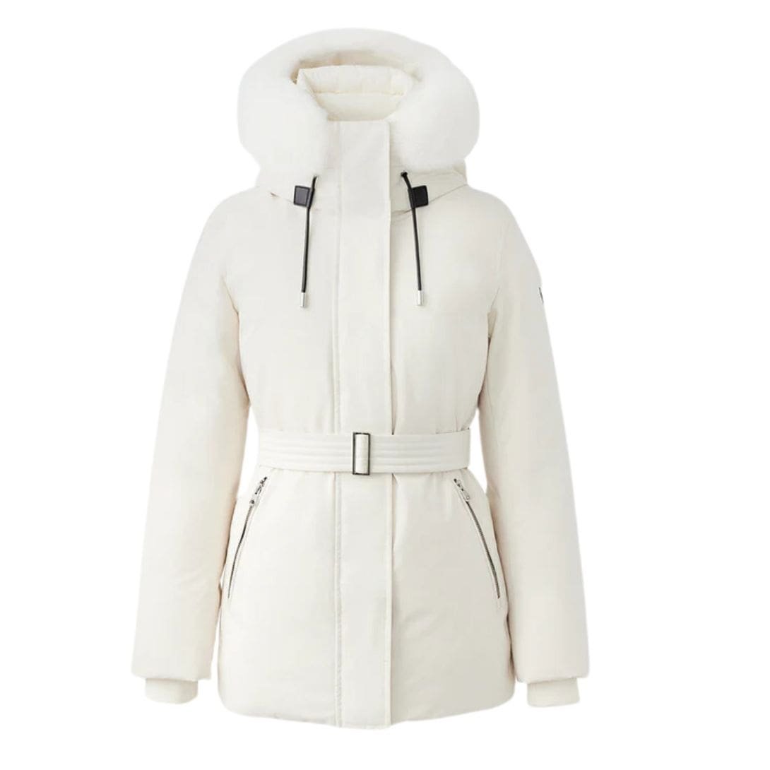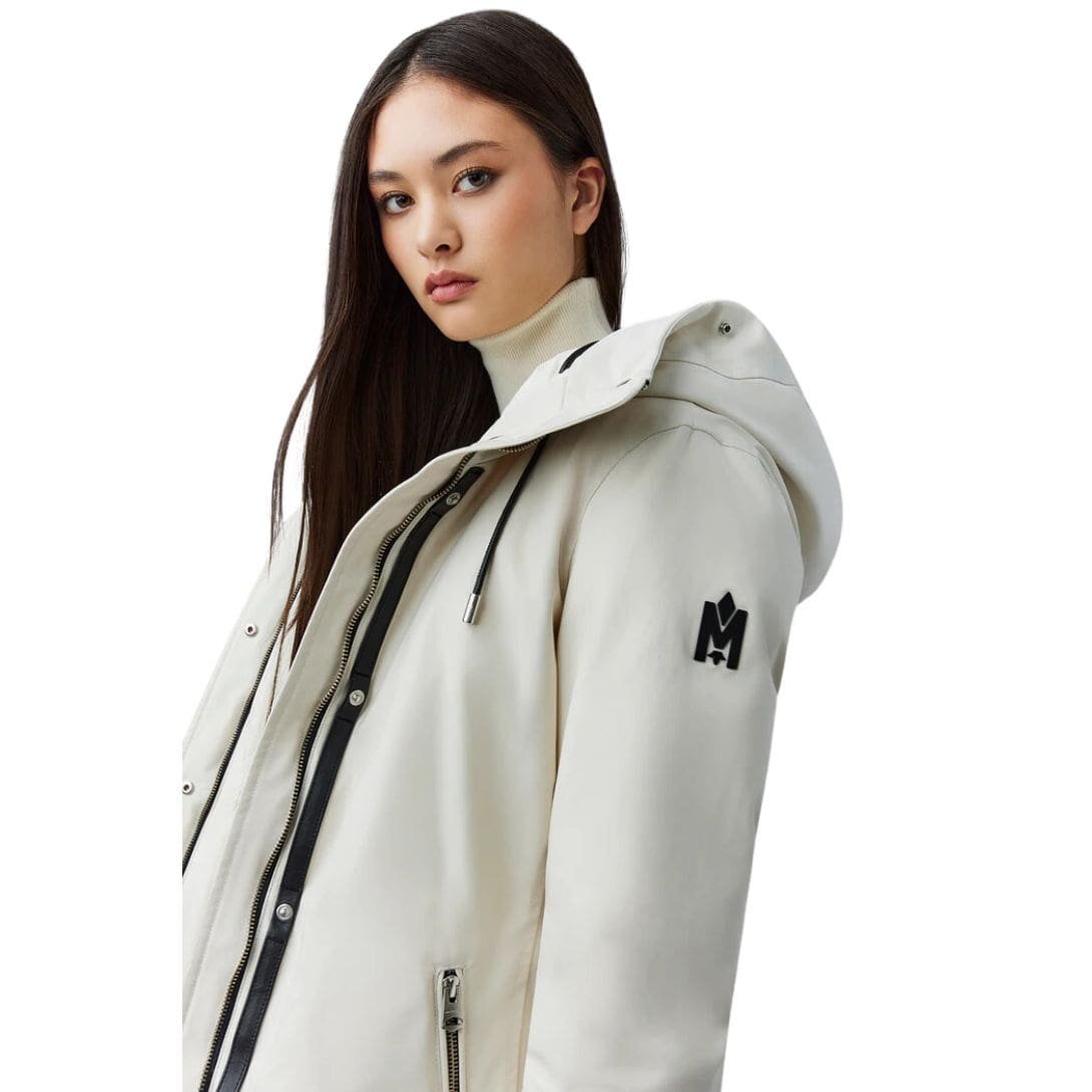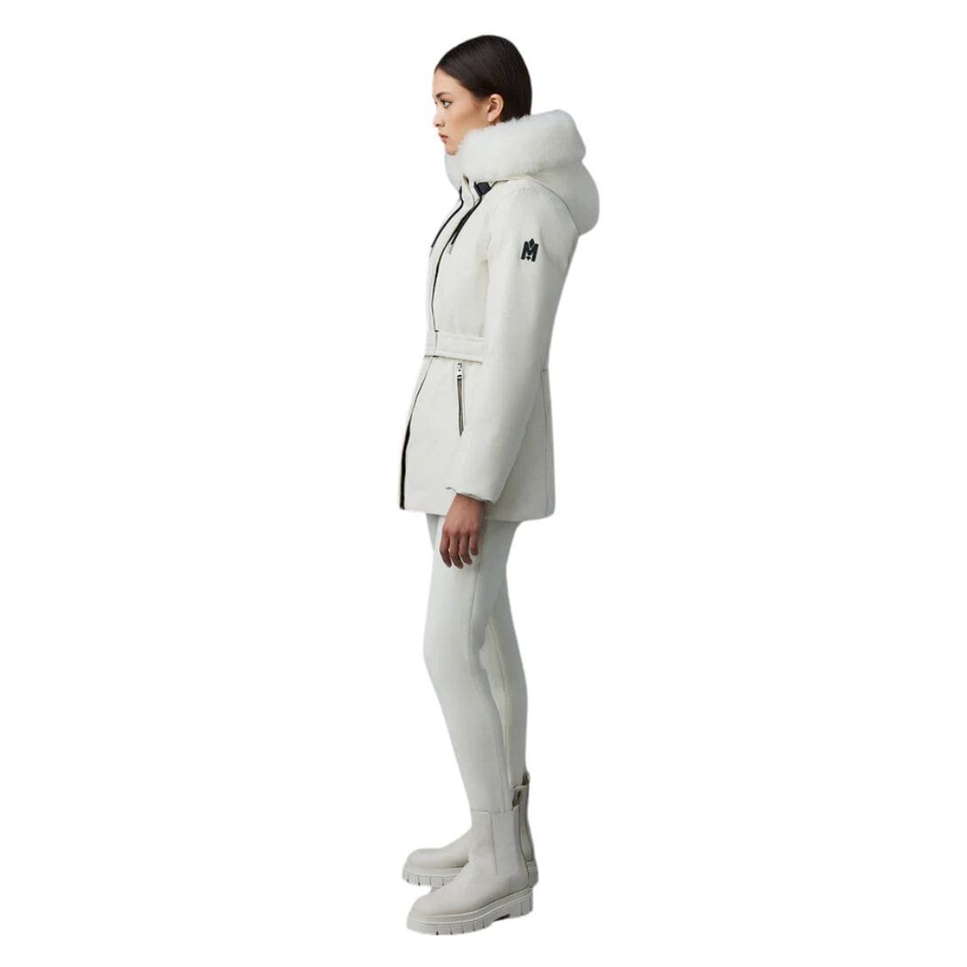 Introducing Mackage Jeni 2-In-1 Down Parka with Removable Bib and Sheepskin Trim, featuring a removable lustrous down bib, sheepskin trim, and adjustable storm visor hood. This structured, semi-fitted parka is designed for maximum comfort and protection on the coldest days. It boasts a proprietary bonded weave, storm placket, and insulated pockets for extra warmth, making it a high-performance staple with modern versatility.