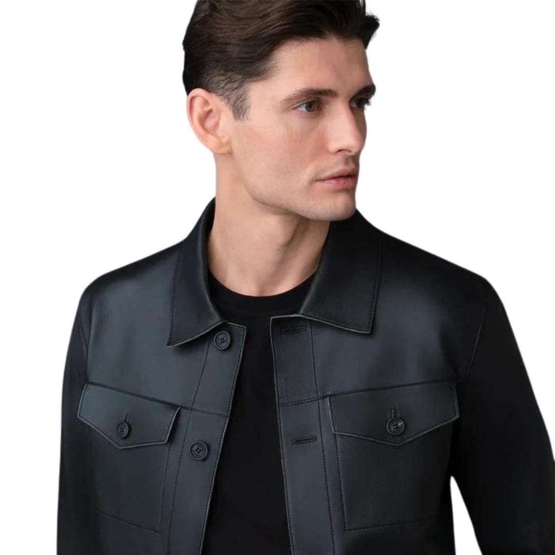 Introducing the Mackage Lincoln Leather Jacket With Horn Buttons is a supple leather trucker jacket with raw edges and edge-painted finishing throughout. The spread collar, flap patch pockets, and horn buttons add to the classic luxe styling, while welt pockets at the waist offer ample storage space for essentials. This is a luxe sartorial solution for a top layer.