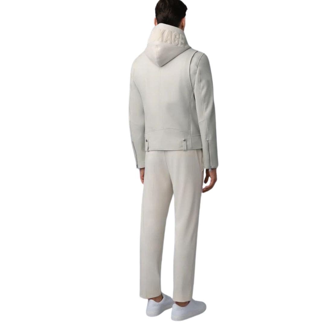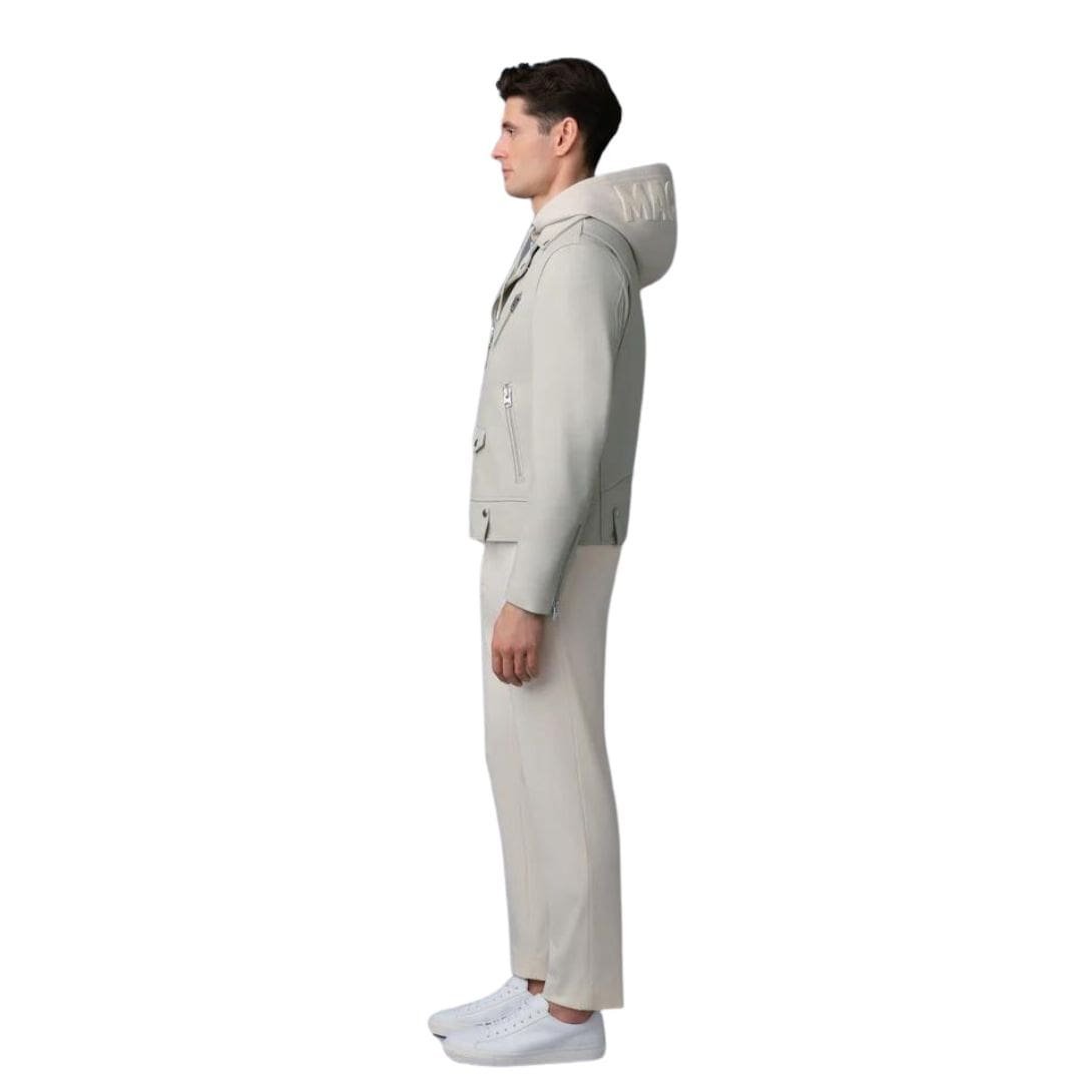 Introducing the Mackage Magnus-Cn 2-In-1 Leather Biker Jacket a timeless biker jacket designed for men and crafted from supple lamb leather. Meticulously tailored for a sleek, slim fit, it boasts a removable tonal hooded bib crafted from plush double face jersey, adding a touch of luxury and versatility to your wardrobe. The distinctive asymmetrical closure, notch collar, and adorned studded tabs showcase its unique detailing. Designed for comfort, the jacket features action back paneling, ensuring ease of movement. A modern and modular statement piece, it’s perfect for any occasion.