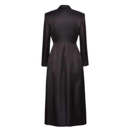 Adding a touch of opulence is a large detachable brooch that adorns the coat’s lapel. This striking embellishment serves as a statement piece, enhancing the coat’s visual appeal with its intricate detailing and sophisticated charm.