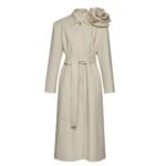 To accentuate the waist and create a flattering silhouette, the coat is cinched with a fabric belt. This adjustable feature not only adds structure to the oversized design but also allows for customization, ensuring a perfect fit for every wearer. The belt adds a touch of femininity to the coat’s silhouette, highlighting the natural curves of the body with grace and elegance.