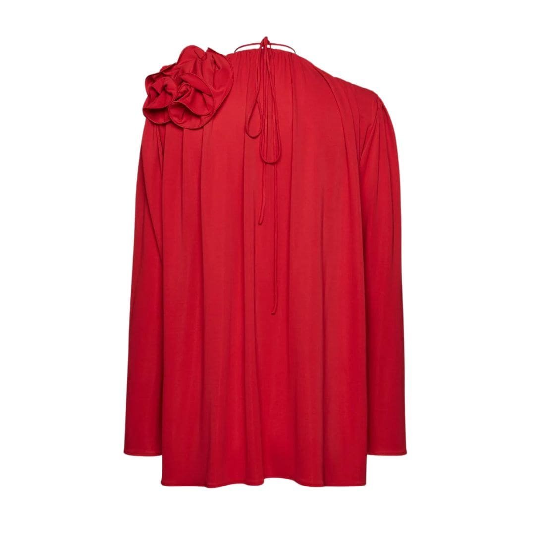 Magda Butrym Classic Jersey Shirred Flower Blouson In Red signature blouse embodies romantic elegance with its billowing design and exquisite details. This standout piece features a flattering V-neckline, adding a touch of femininity and sophistication to any outfit. The concealed button closure ensures a seamless look, maintaining the blouse’s clean and polished aesthetic.