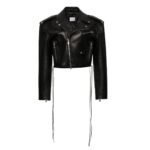 At the heart of the jacket lies its distinctive cropped silhouette, which offers a modern twist on the timeless biker aesthetic. This abbreviated length not only adds a sense of youthful exuberance but also allows for effortless layering, making it the perfect companion for both casual outings and evening soirées alike.