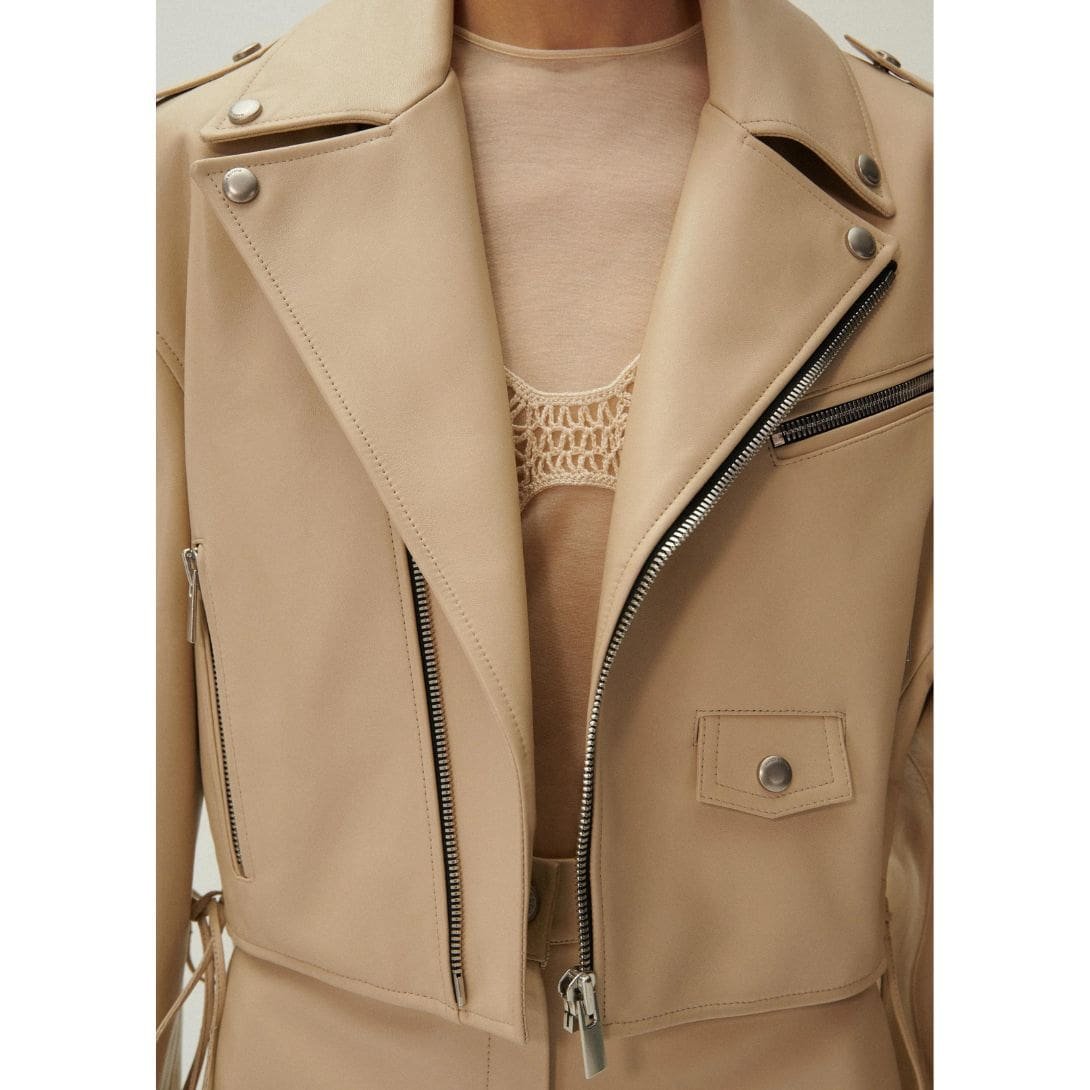 The light beige colourway of this jacket adds a fresh and contemporary twist to the classic moto style. Versatile and chic, this neutral hue complements a wide range of outfits and colour palettes, making it a versatile addition to any wardrobe.