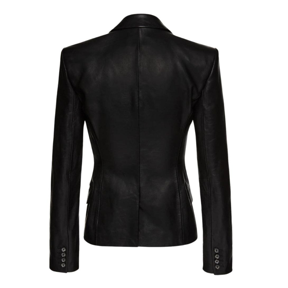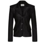 Crafted from high-quality leather, the blazer not only exudes luxury but also offers durability and longevity. The supple texture of the leather adds a tactile dimension to the garment, inviting a touch and further enhancing its allure. The rich black hue of the leather lends versatility to the blazer, allowing it to seamlessly integrate into any wardrobe while adding a touch of understated glamour.