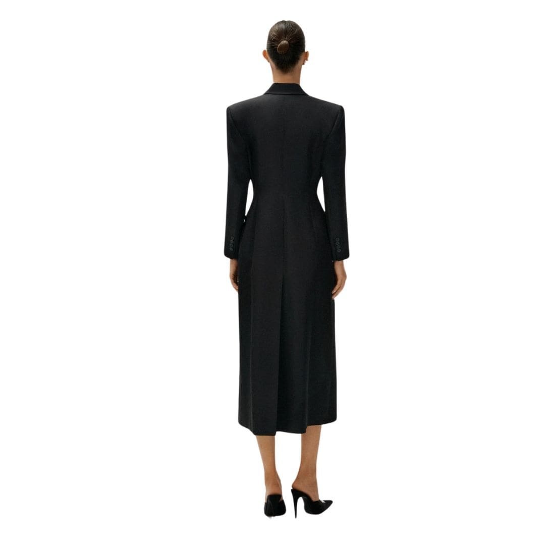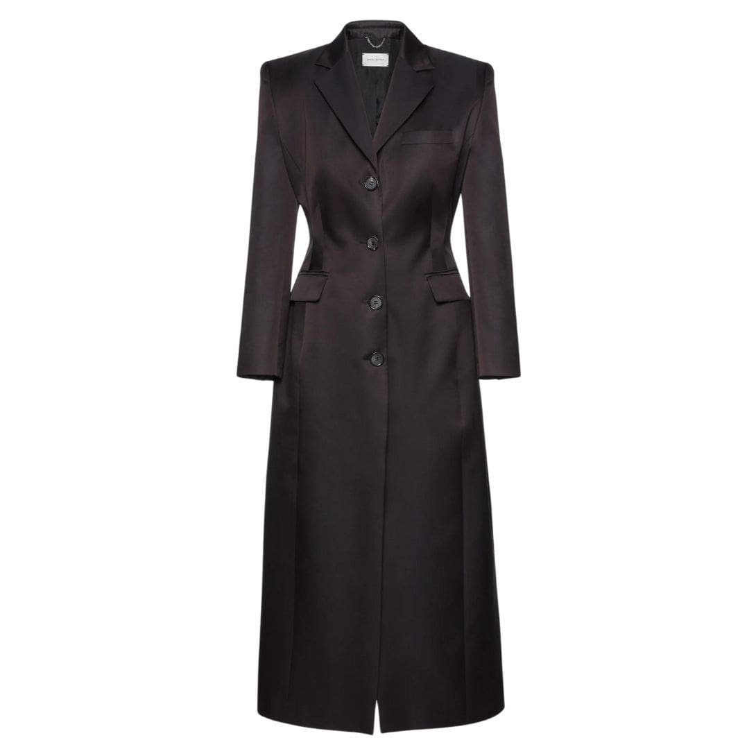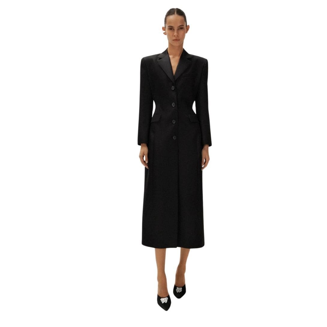Magda Butrym introduces a fresh interpretation of the MAGDA BUTRYM HOURGLASS SINGLE BREASTED SILK COAT IN BLACK, specially crafted for the spring season in lightweight silk. This rendition of the beloved silhouette embraces the iconic hourglass shape, characterized by its strong shoulders, oversized fit, peak lapels, and ankle-length design.