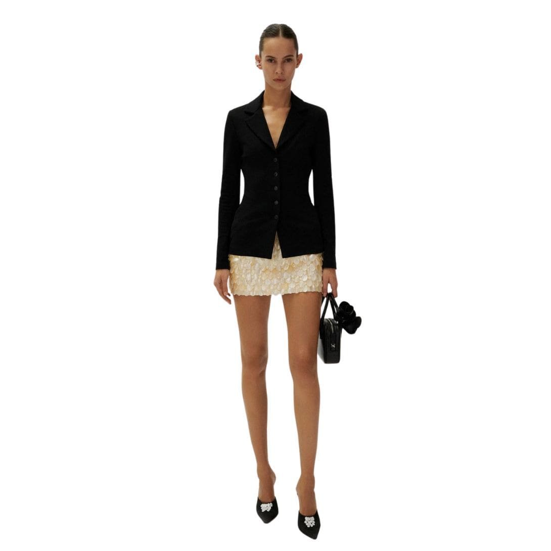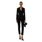The peak lapels add a timeless touch of sophistication to the blazer, elevating its overall aesthetic. The sharp, angular lines of the lapels draw attention to the neckline, framing the face and adding structure to the silhouette. This classic design detail reflects the brand’s commitment to impeccable tailoring and design, ensuring that every aspect of the blazer is carefully considered.