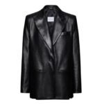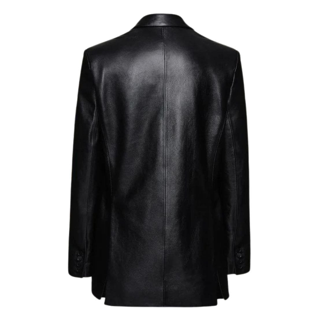 The blazer features a simple yet elegant cut, emphasizing clean lines and a minimalist aesthetic. The single-button closure at the front is both functional and stylish, providing a secure fit while maintaining the blazer’s sleek profile. This single button, carefully chosen to complement the black leather, adds a subtle touch of refinement without overpowering the overall design.