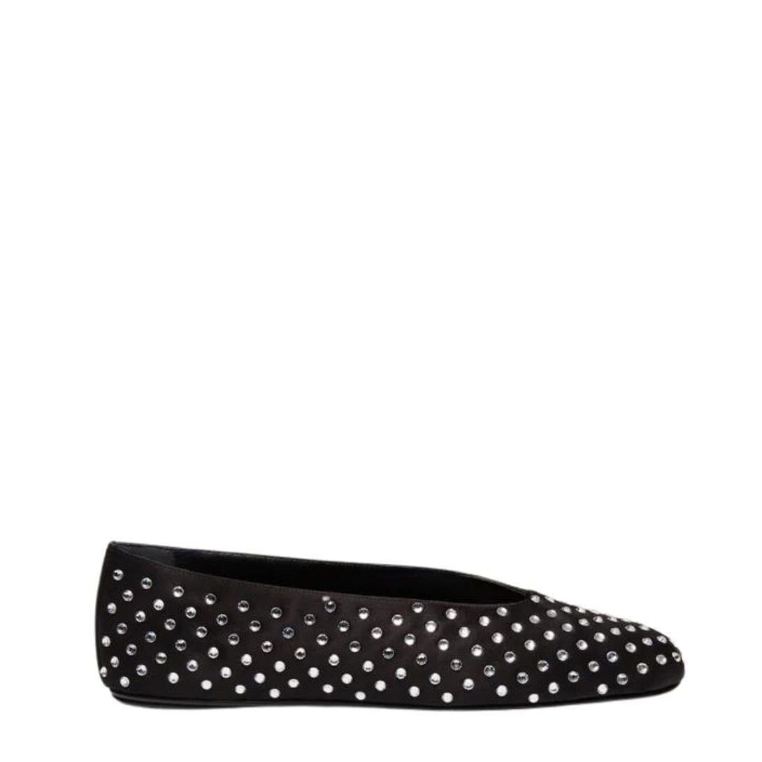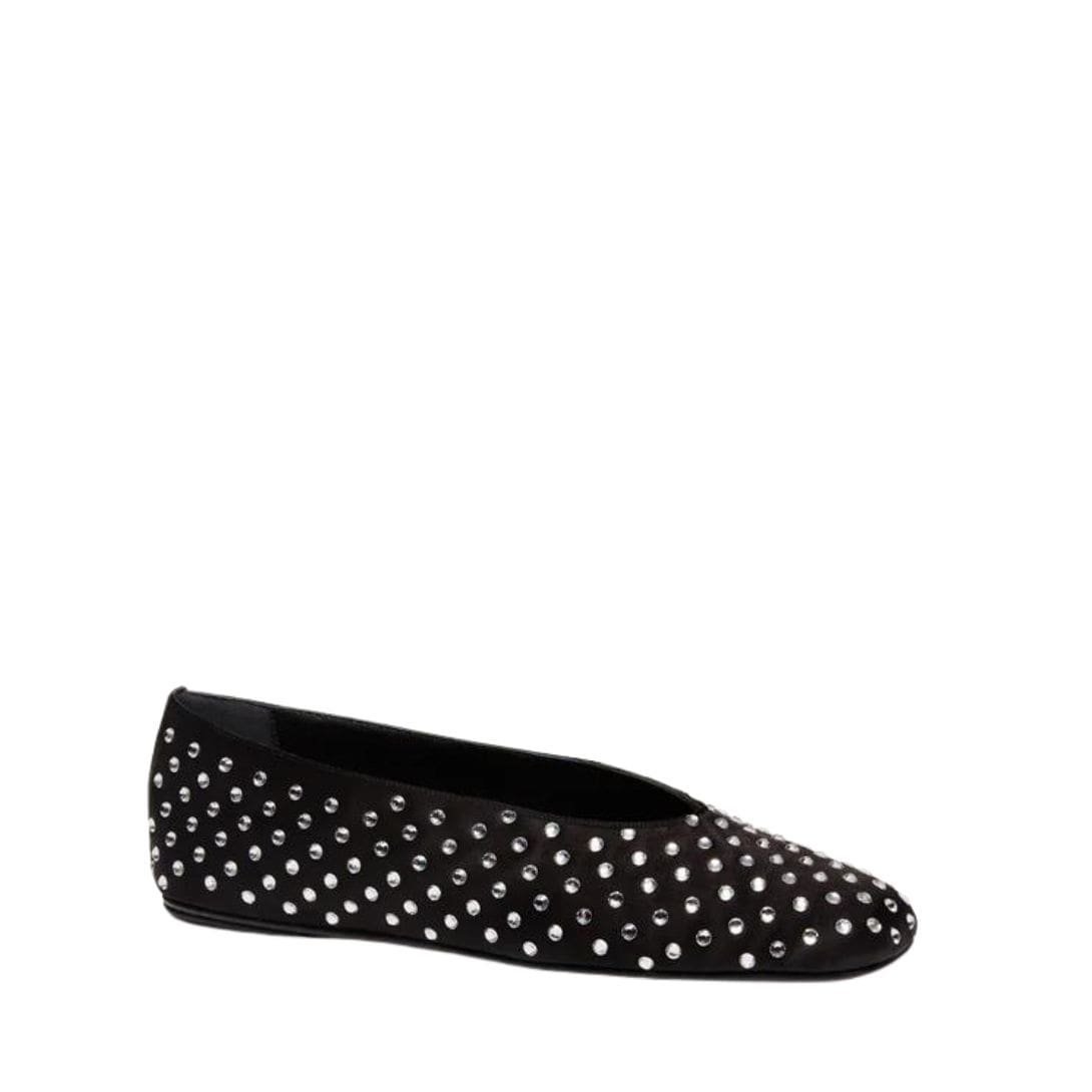 The Magda Butrym Satin Ballet Flats in black Crystals. with crystals representing the epitome of modern elegance and sophistication. These flats are expertly crafted in Italy, a country renowned for its impeccable craftsmanship and attention to detail. This ensures that each pair of flats is of the highest quality, combining both aesthetic beauty and practical functionality.