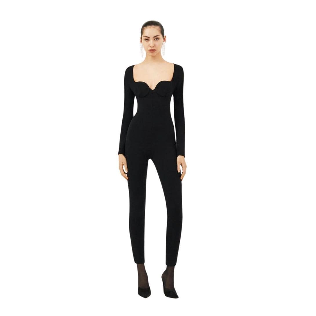 Designed for both comfort and elegance, this bodysuit jumpsuit is versatile for various settings. Its seamless integration of a bustier neckline with knitwear creates a flattering and streamlined look, perfect for pairing with statement accessories or layering under a tailored blazer for added refinement.