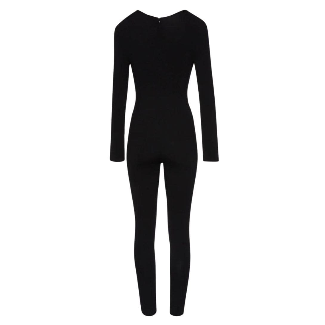 The silk knit fabric lends a luxurious feel to the jumpsuit, offering a smooth and soft texture against the skin. The long sleeves provide coverage while complementing the sleek, skinny legs that elongate the silhouette. The open bustier neckline adds a touch of daring sophistication, enhancing the jumpsuit’s appeal for evening events or stylish occasions.