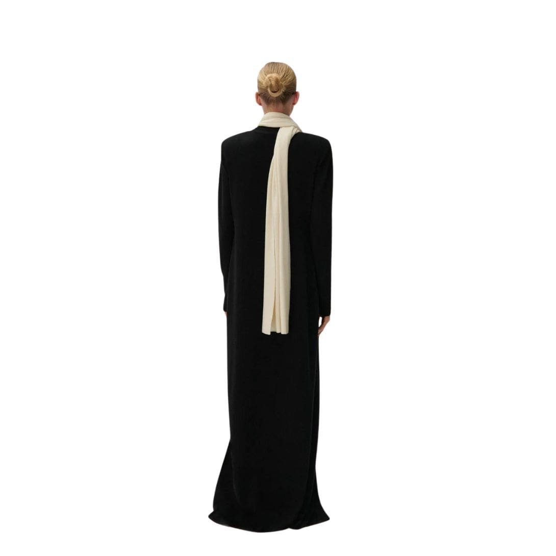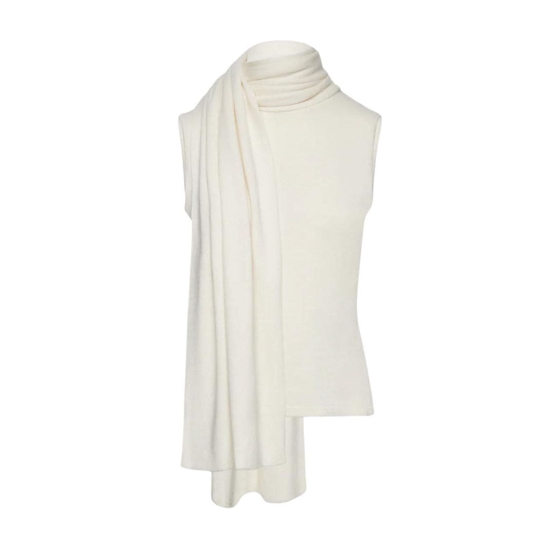 The Magda Butrym Sleeveless High Neck Knit Top in cream is a statement piece that effortlessly combines elegance with modern design. This luxurious top features a sophisticated turtleneck and a dramatic sash scarf detail that adds a touch of flair and refinement.