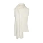 In summary, the Magda Butrym Sleeveless High Neck Knit Top in cream is a luxurious and versatile piece, perfect for those who appreciate high-quality materials and sophisticated design. The blend of wool, silk, and cashmere, combined with the dramatic sash scarf detail, makes this top a standout item that adds elegance and style to any outfit.