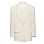 In summary, the Magda Butrym Tailored Oversized Handwoven Blazer in Cream is a true testament to the brand’s commitment to craftsmanship and innovation. With its handwoven fabric, oversized silhouette, notch lapels, single button closure, oversized shoulder pads, and front pockets, this blazer is a luxurious statement piece that exemplifies elegance and sophistication.