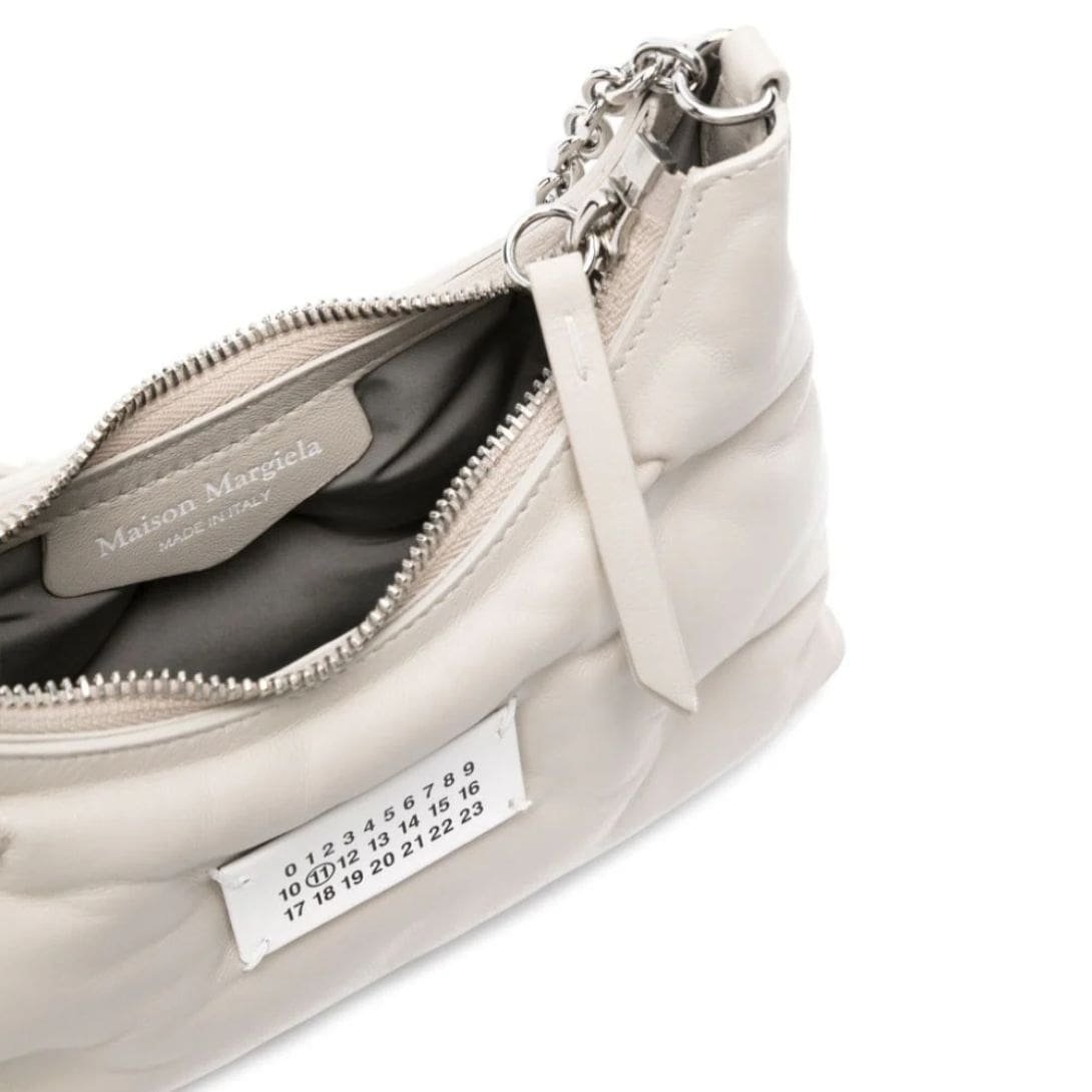 Introducing the Maison Margiela Micro Glam Slam Shoulder Bag, a stunning addition to Maison Margiela’s renowned Glam Slam line. Crafted with precision in Italy, this shoulder bag features tufted quilting, lending it a soft, pillowy look that defines the collection. The bag is crafted from luxurious ecru lambskin, boasting a smooth grain texture and an elegant arched silhouette.