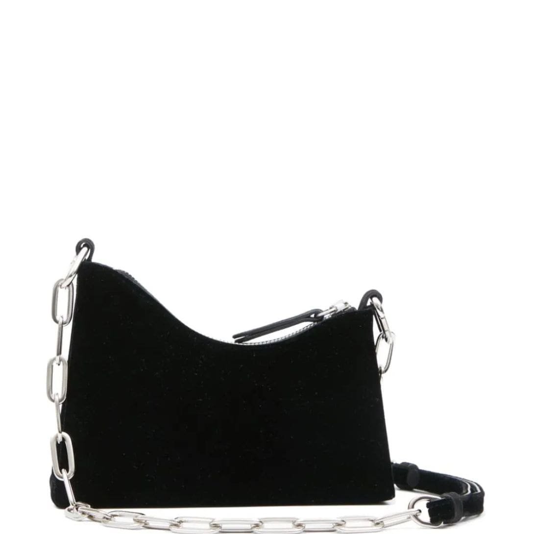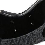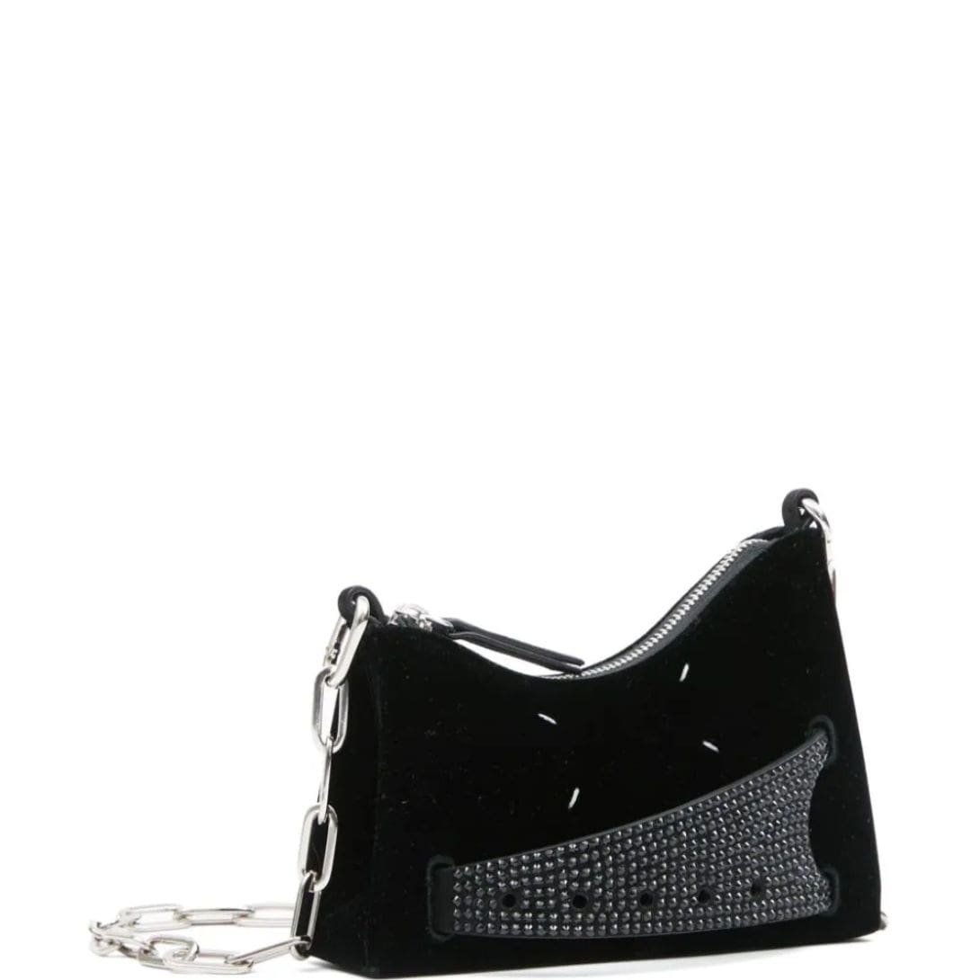 Maison Margiela small Snatched leather shoulder bag embodies the brand’s avant-garde aesthetic with its distinctive arched, asymmetric shape. Crafted in Italy from luxurious black velvet, this iteration features a crystal-embellished front handle that defines its unique design. The iconic four-stitch logo adorns the front, adding a signature touch.