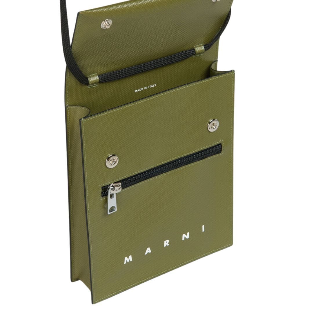 Crafted from high-quality materials, the Marni Green Pouch boasts durability while maintaining a soft, supple texture. The pouch itself is compact, yet spacious enough to hold essentials like a phone, wallet, and keys. Its minimalist design is enhanced by a subtle Marni logo embossed on the front, reflecting the brand’s commitment to understated elegance.