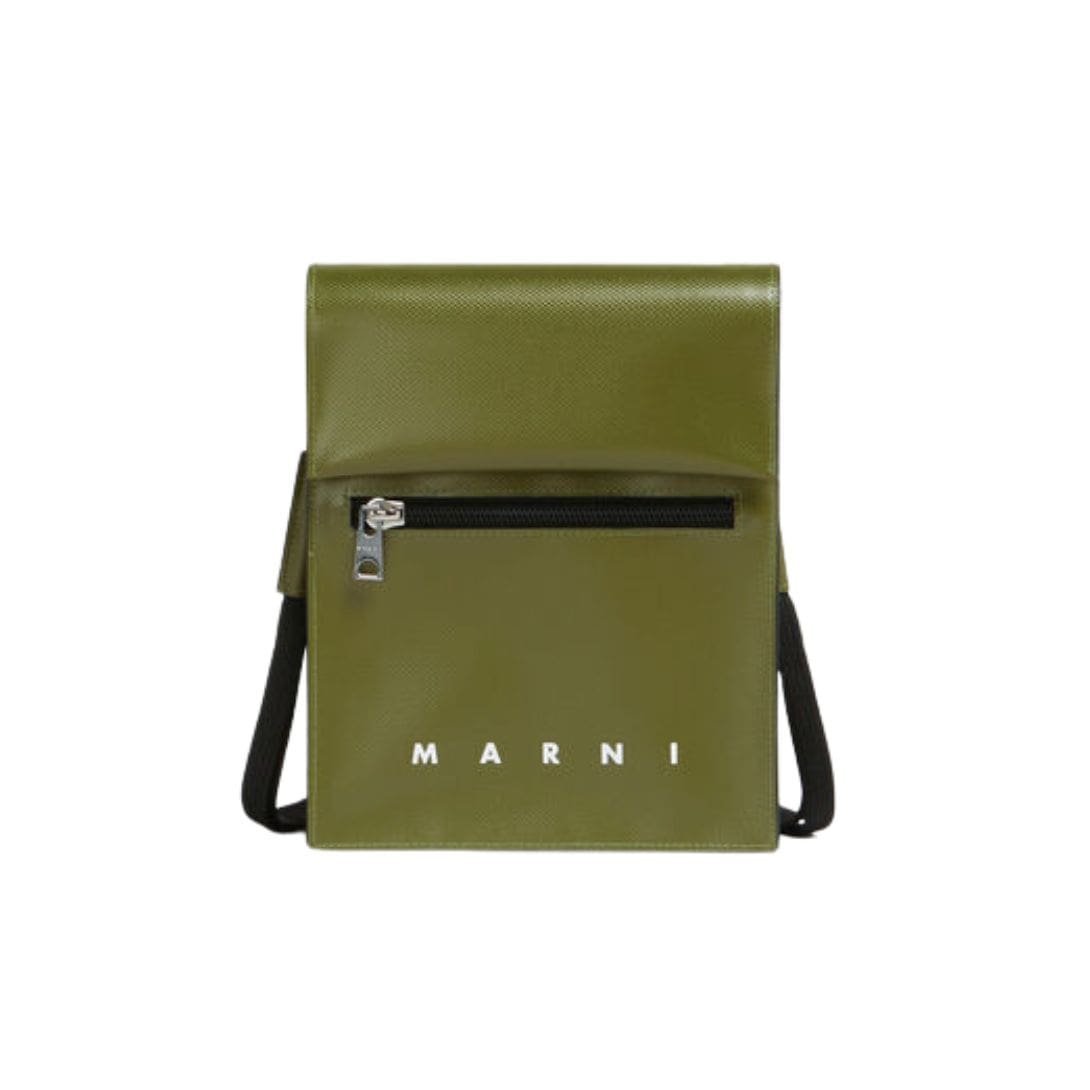 Marni Green Pouch with Shoelace Strap embodies a unique blend of style and functionality. Marni, renowned for its innovative approach to fashion, has outdone itself with this accessory. The pouch features a vibrant green hue that stands out effortlessly, adding a pop of color to any outfit. The shade is bold yet versatile, perfect for those who want to make a statement without overwhelming their ensemble.