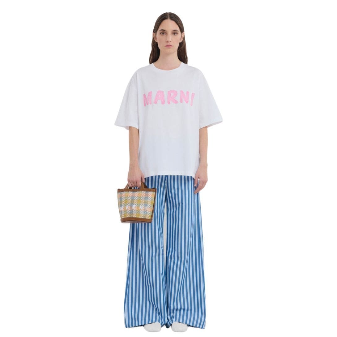 Overall, the Marni Tropicalia Small Bucket Bag in leather and checked raffia-effect fabric is a testament to the brand’s commitment to craftsmanship and innovative design. It embodies a perfect blend of sophistication and fun, making it a versatile addition to any wardrobe. Whether paired with casual outfits or more formal ensembles, this bag is sure to make a statement, reflecting Marni’s signature style of combining luxury with a playful twist.
