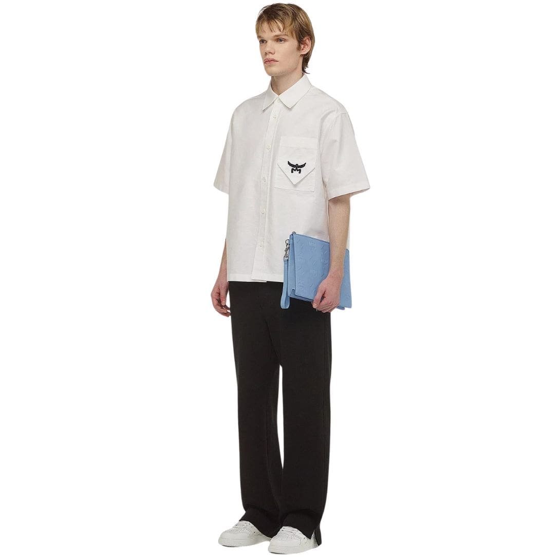 Crafted with meticulous attention to detail, the MCM Aren Wristlet Zip Pouch In Maxi Monogram Leather Blue stands as a testament to timeless elegance and sophistication. This exquisite creation transforms the classic trilogy of letters, laurels, and diamonds into a bold statement piece, magnified upon the supple canvas of full-grain Nappa leather. Each stroke of the embossed Maxi Visetos monogram exudes luxury, capturing the essence of opulence and refinement.