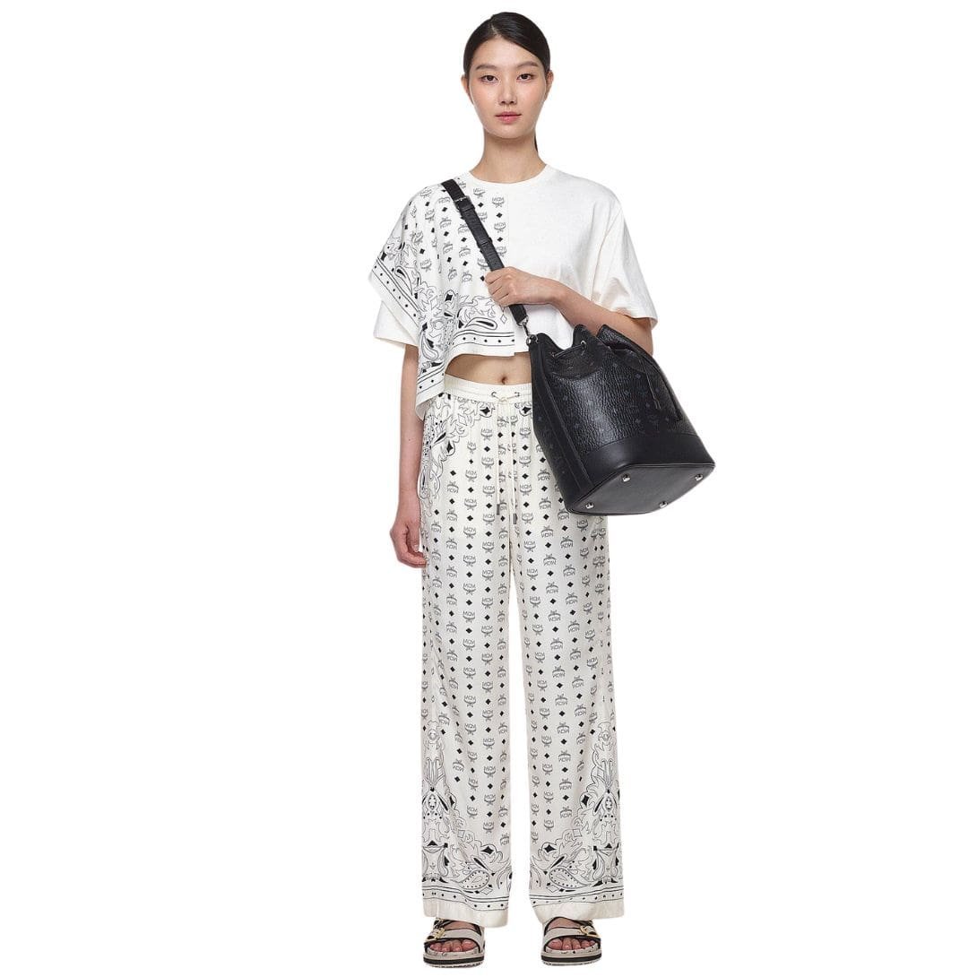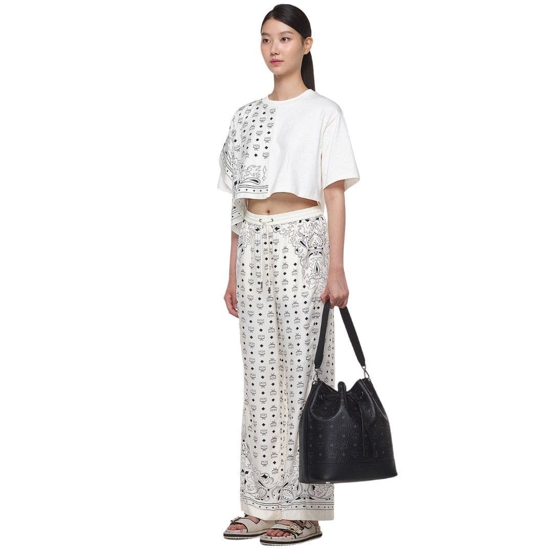 The MCM Large Dessau Drawstring Bag In Visetos Black pays homage to the Bauhaus movement, named after the historic hub of design innovation. Reflecting the movement’s principles of form and function, this bag embodies timeless elegance. Crafted with meticulous attention to detail, it combines the iconic Visetos monogram-coated canvas with luxurious Nappa leather trim.