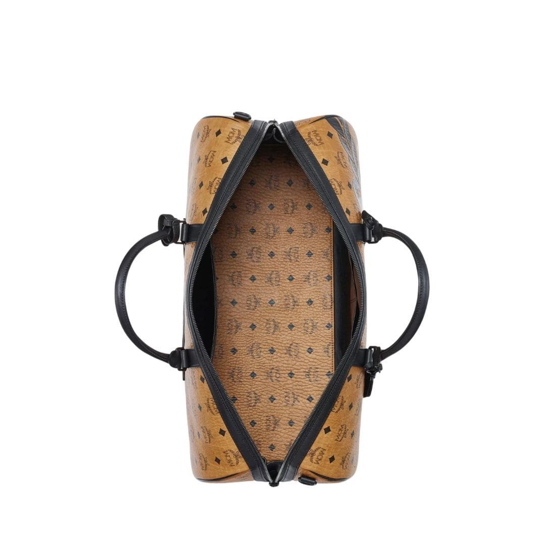 Crafted from MCM’s signature Visetos monogram canvas and trimmed with luxurious Nappa leather, the bag is accented with matte black metal hardware, creating a sleek and modern look. It is designed to fit comfortably in overhead bins, making it ideal for air travel.