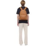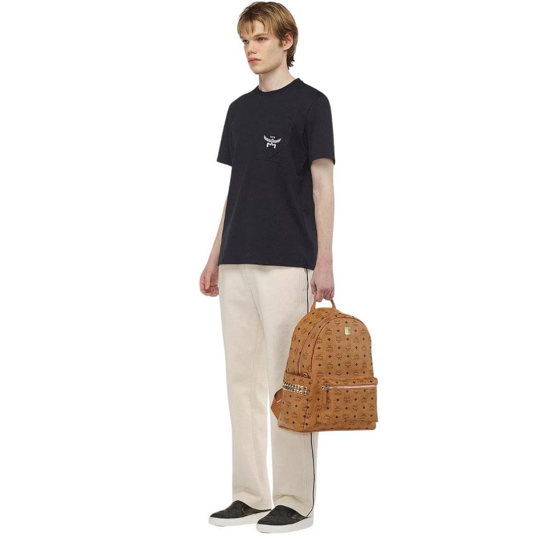Step into the realm of luxury with the epitome of sophistication and style embodied in the meticulously crafted signature MCM Stark Side Studs Backpack In Visetos Cognac adorned with sumptuous Nappa leather trim. This structured marvel is not just a bag; it’s a statement, a symbol of refinement and elegance.