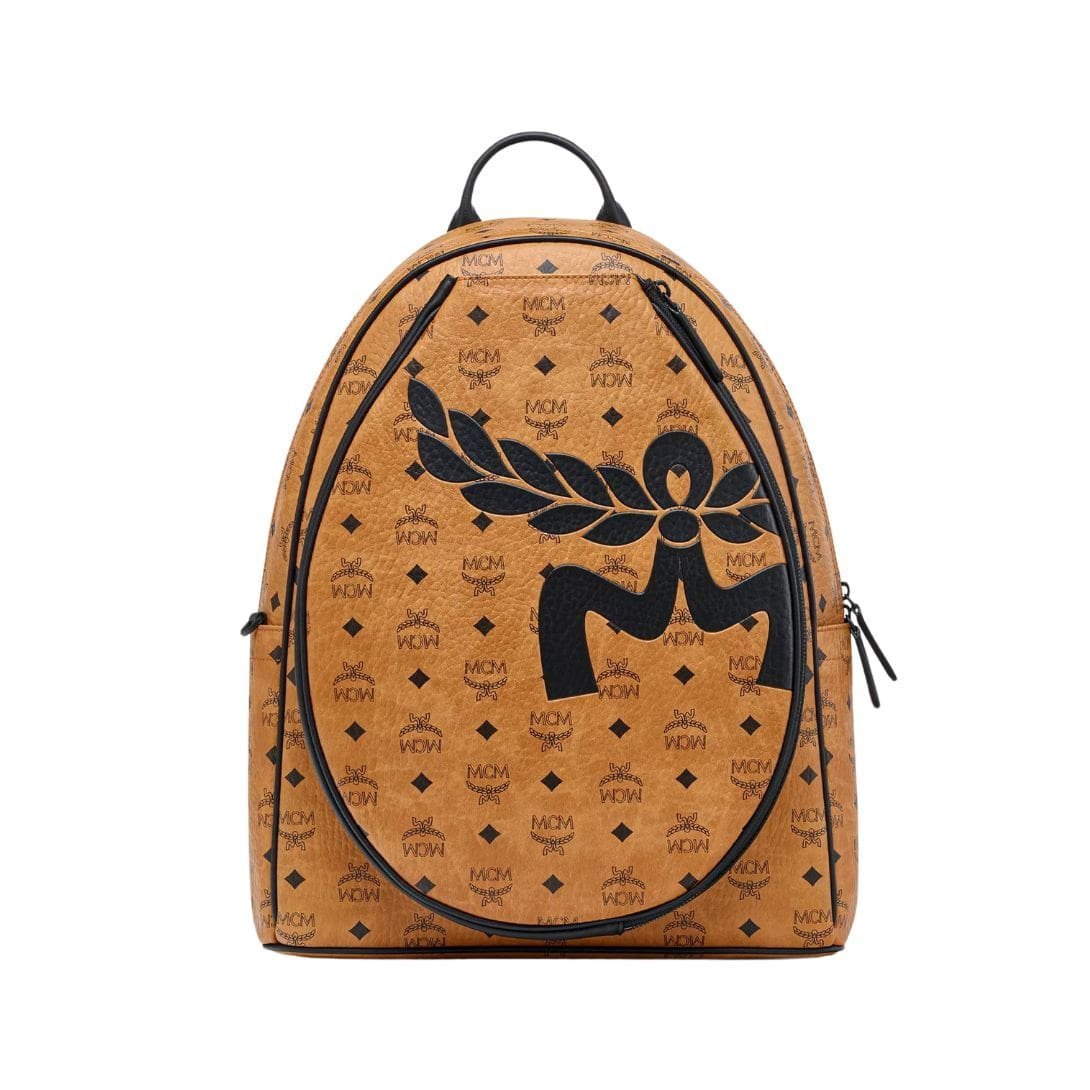 The MCM Stark Tennis Backpack In Mega Laurel Visetos Cognac. presents a contemporary twist on the classic flagship silhouette, tailored specifically for tennis enthusiasts. This season’s iteration of the iconic Stark backpack pays homage to the sport of tennis, seamlessly blending athletic functionality with MCM’s signature style.