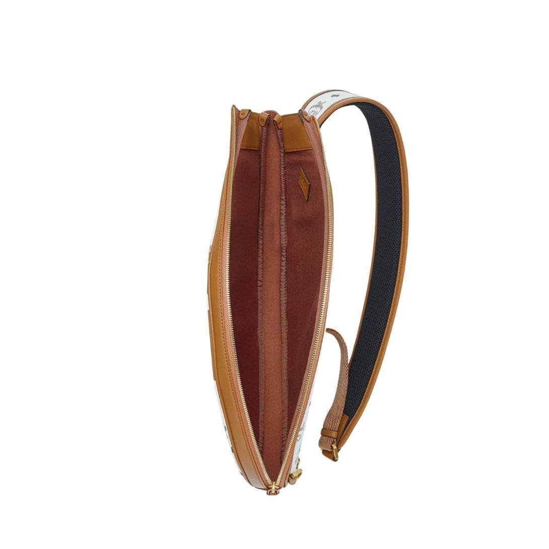 The MCM Tennis Racket Cover in Mega Laurel Visetos White. is an ace accessory that brings together elegance and practicality for the discerning sports enthusiast. This tennis racket cover is crafted from MCM’s signature Visetos monogram canvas and enriched with the victorious visage of laurel leaves, symbolizing triumph and excellence.