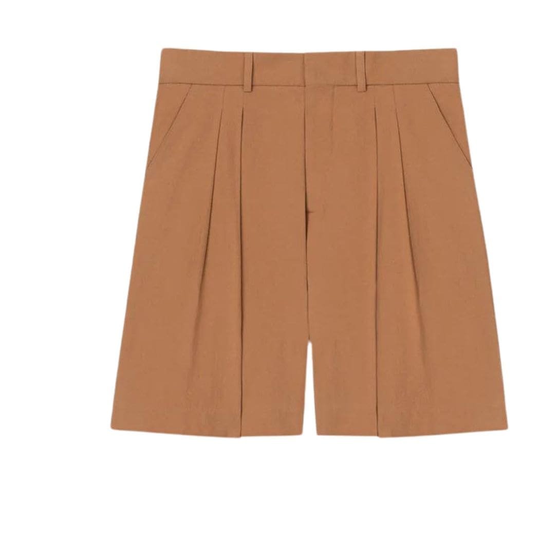 The pleated design of the Carsten shorts adds depth and dimension to their aesthetic appeal, elevating them from simple basics to statement pieces. The wide leg further contributes to the shorts’ relaxed yet sophisticated vibe, allowing for ease of movement and a sense of effortless chic.