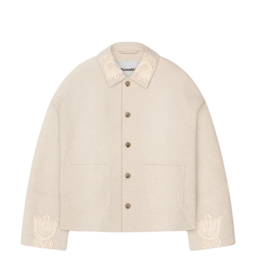 In summary, the Nanushka Miller Embroidered Washed Canvas Jacket in Nude is a celebration of cultural heritage and modern design. Its intricate Hungarian kopjafa embroidery, soft yet durable washed canvas, and relaxed fit make it a unique and versatile piece. This jacket not only embodies the essence of Nanushka’s commitment to craftsmanship and detail but also serves as a stylish and meaningful addition to any wardrobe.