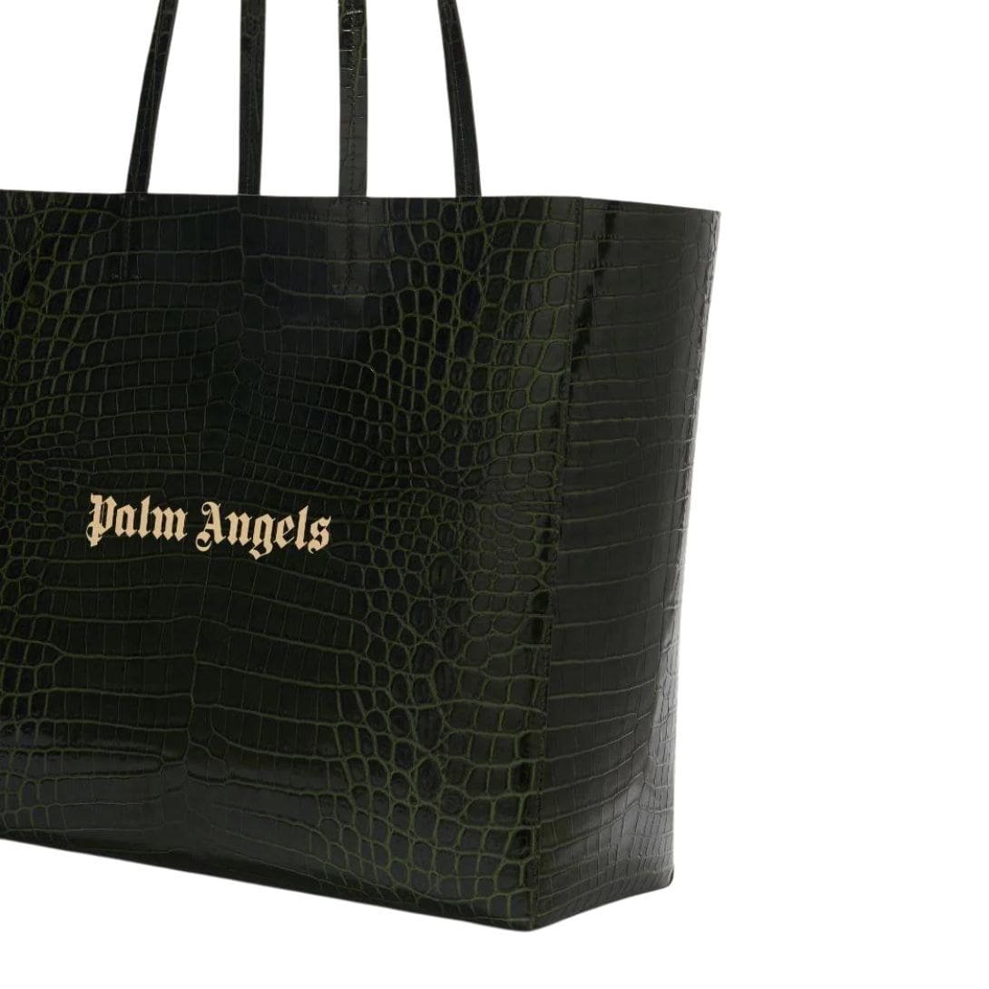 The design of the bag is marked by its distinctive Palm Angels branding. The iconic palm tree logo, a symbol of the brand’s effortless cool, is prominently displayed on the front, adding a touch of playful elegance. The logo is complemented by bold, contrasting text that further emphasizes the bag’s unique style. This eye-catching detail makes the bag not just a practical accessory, but also a statement piece that enhances any outfit.