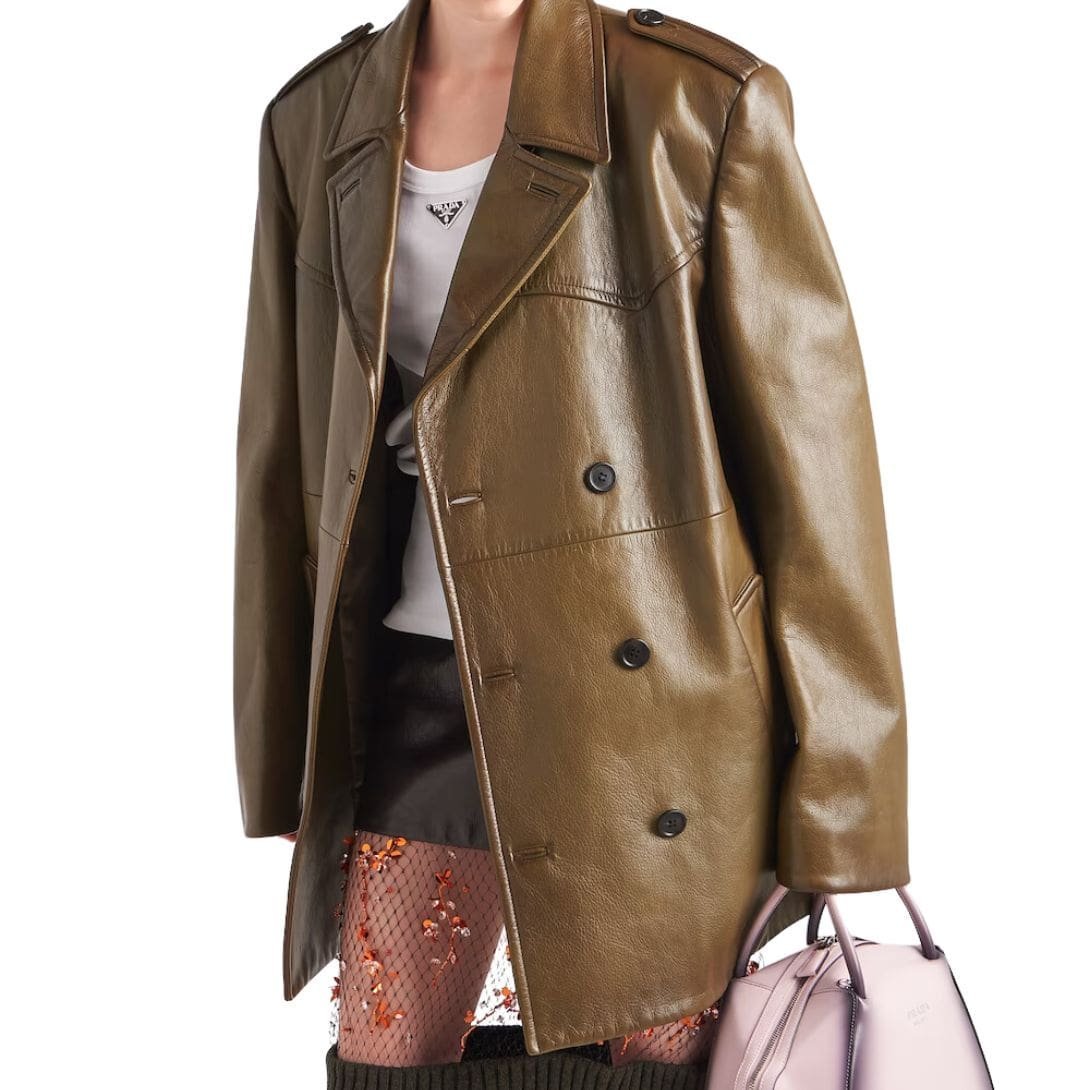 Beyond its aesthetic appeal, the Prada Double Breasted Leather Coat offers practicality and comfort. The luxurious leather not only provides warmth but also molds to the wearer’s body over time, ensuring a personalized fit and unparalleled comfort.