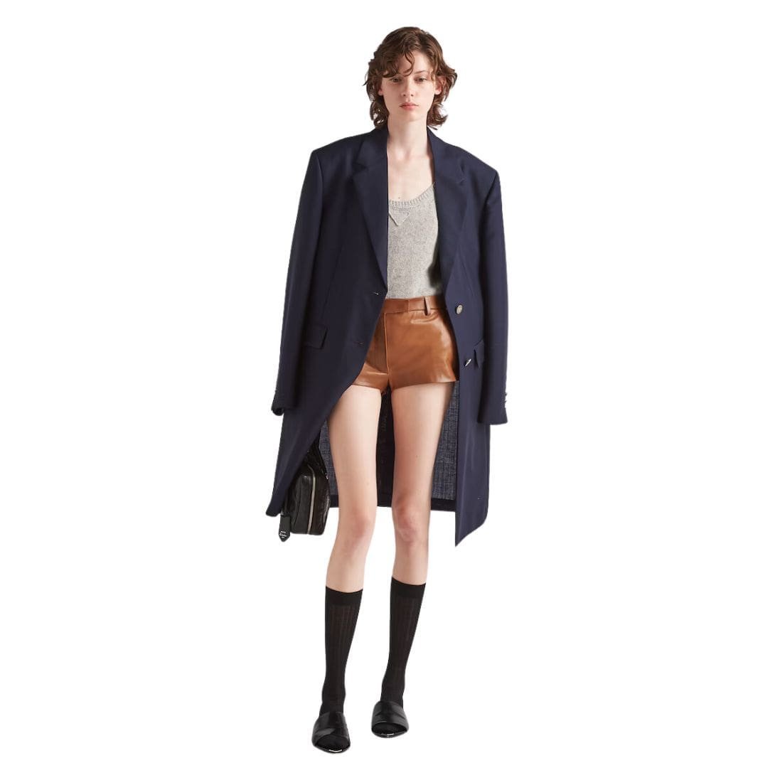 The design of the Prada Nappa Leather Shorts is both sleek and sophisticated, reflecting the minimalist yet innovative approach synonymous with the Prada brand. Featuring a high waistline, these shorts accentuate the silhouette, creating a flattering and elongating effect. The fit is tailored yet relaxed, allowing for ease of movement while maintaining a chic and structured look.