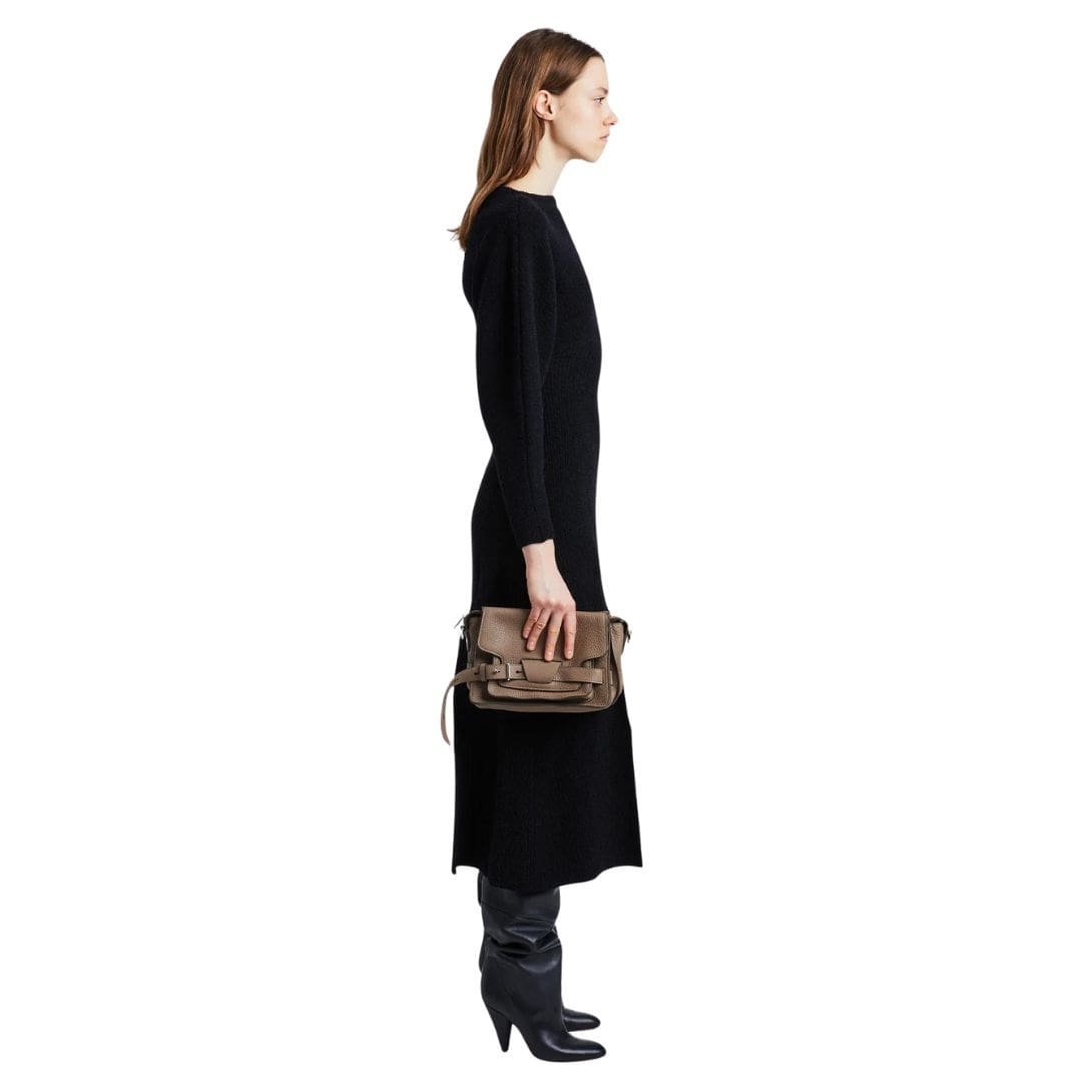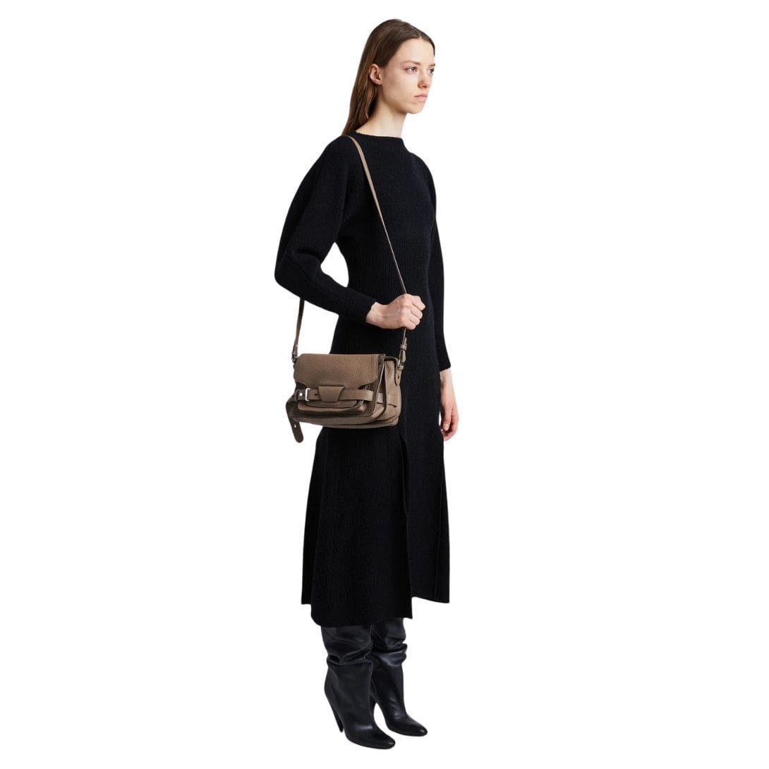 At the forefront of the design is a fold-over flap secured by signature belted straps adorned with a distinguished D-ring buckle. Inspired by the utilitarian aesthetic of workwear satchels, these straps not only enhance the bag’s visual appeal but also ensure the safety of your belongings, adding a touch of rugged charm to its overall elegance.