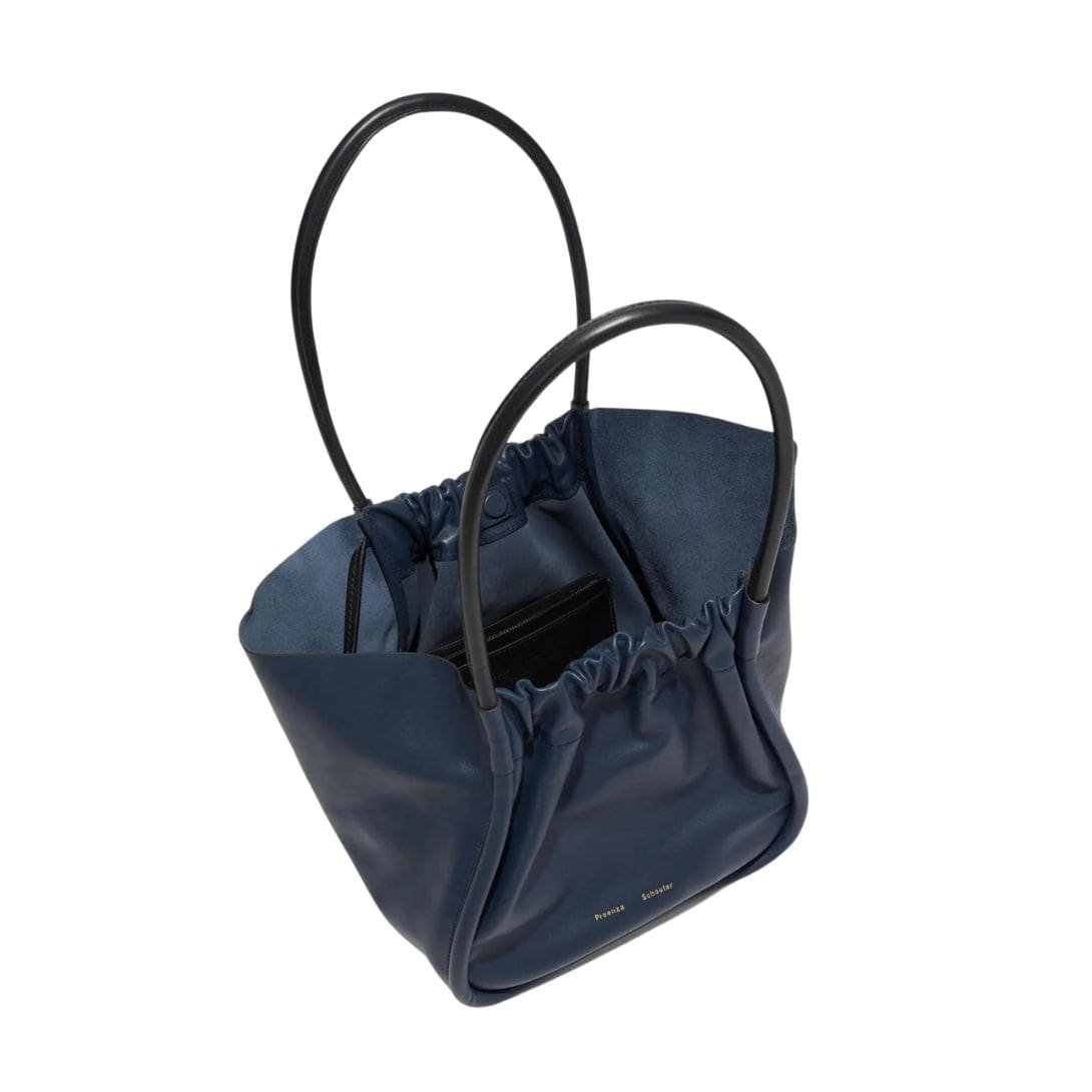 Immerse yourself in the epitome of refined sophistication with the Proenza Large Ruched Tote Dark Navy, a pinnacle of luxurious design crafted to embody a soft, unstructured silhouette. This exquisite tote, a proud member of the illustrious Tote family, exudes timeless elegance and practical functionality, making it a versatile companion for any occasion.