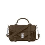 Taking cues from the Proenza PS1 Tiny Bag In Suede Teak. timeless appeal of traditional workwear satchels, the PS1 Tiny Bag in Suede epitomizes a harmonious blend of practicality and effortless style. Crafted from sumptuously smooth calfskin suede, this iteration exudes understated sophistication in a deep, dark brown hue, offering versatility for any occasion.