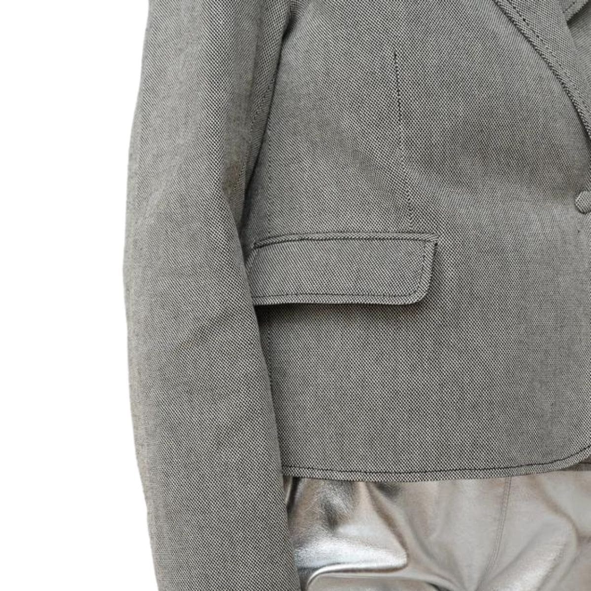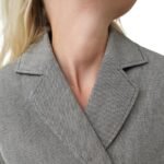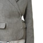The blazer is designed with a double-breasted front, adorned with striking silver-tone buttons that add a touch of modernity and shine. The notched lapels and sharp shoulders enhance the blazer’s refined aesthetic, while the slightly cinched waist creates a feminine shape. The meticulous attention to detail is evident in the impeccable stitching and the luxurious lining, ensuring a comfortable and flawless fit.