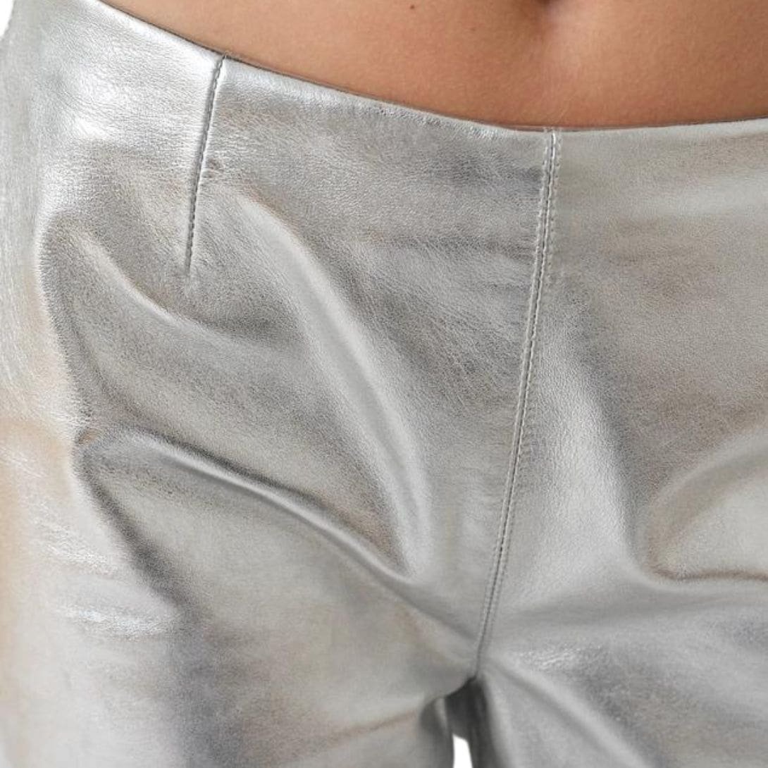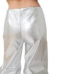 The pants are designed with a slim, tapered fit through the hips and thighs, gradually flaring out from the knee to the hem. This design choice not only elongates the legs but also adds a sense of movement and fluidity to the garment. The shiny, silver fabric is both eye-catching and versatile, allowing the pants to be dressed up with a blouse and heels for a chic evening look or paired with a simple top and sneakers for a more casual, yet still striking, outfit.