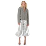 The Steffi Pants feature a high-rise waistband that enhances the silhouette, providing a flattering fit and a sleek appearance. The tailored design ensures a sharp, sophisticated look, while the slightly flared legs offer a nod to retro influences, adding a dynamic element to the overall design. The waistband is complemented by a hidden zip closure at the back, maintaining the sleek lines and ensuring a smooth fit. SAKS POTTS STEFFI PANTS SILVER