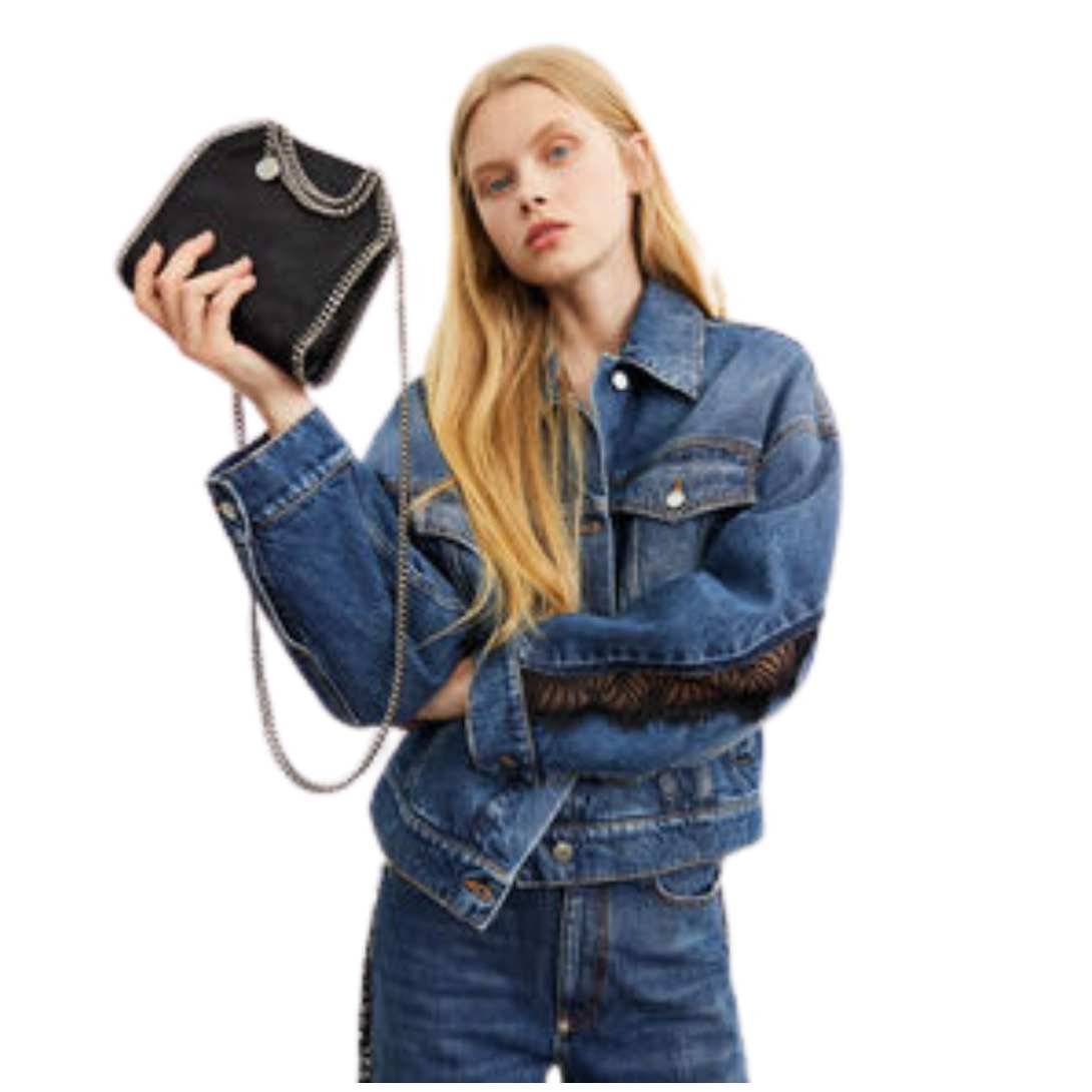 Introducing your everyday style essential: the Stella McCartney Falabella tiny tote bag in steel grey. Crafted in an elegant tiny size, this classic vegan tote is made from matte Shaggy Deer fabric with a semi-gloss grain, offering a slouchy silhouette that effortlessly elevates any ensemble. Framed by our signature Falabella diamond-cut chain hand-laced with waxed GOTS-certified organic cotton, this bag comfortably accommodates all phones, small and medium wallets, alongside daily essentials.