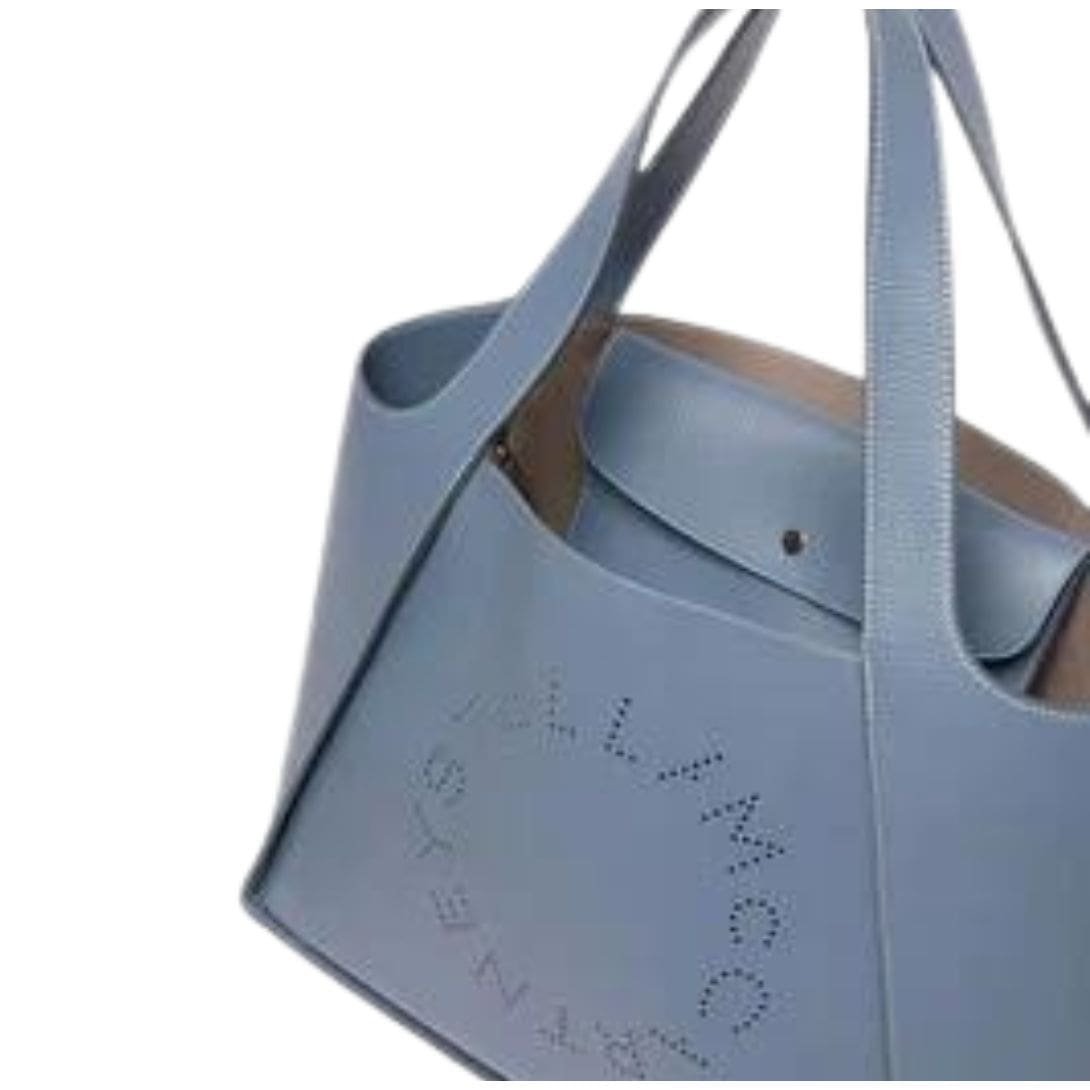 Our stella mccartney Logo grainy alter mat tote bag has been updated for durability and everyday use, consciously crafted from embossed grainy Alter Mat, our vegan alternative to animal leather. This top-handled tote features the signature circular Stella McCartney logo perforated on the front and includes a practical, buttoned pouch inside for easy organization.