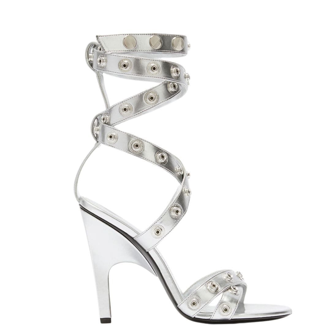 The Attico ”Cosmo” Silver Double Ankle Strap Sandal in silver eco-patent leather with double ankle straps and snaps, height 105mm. Made in Italy.