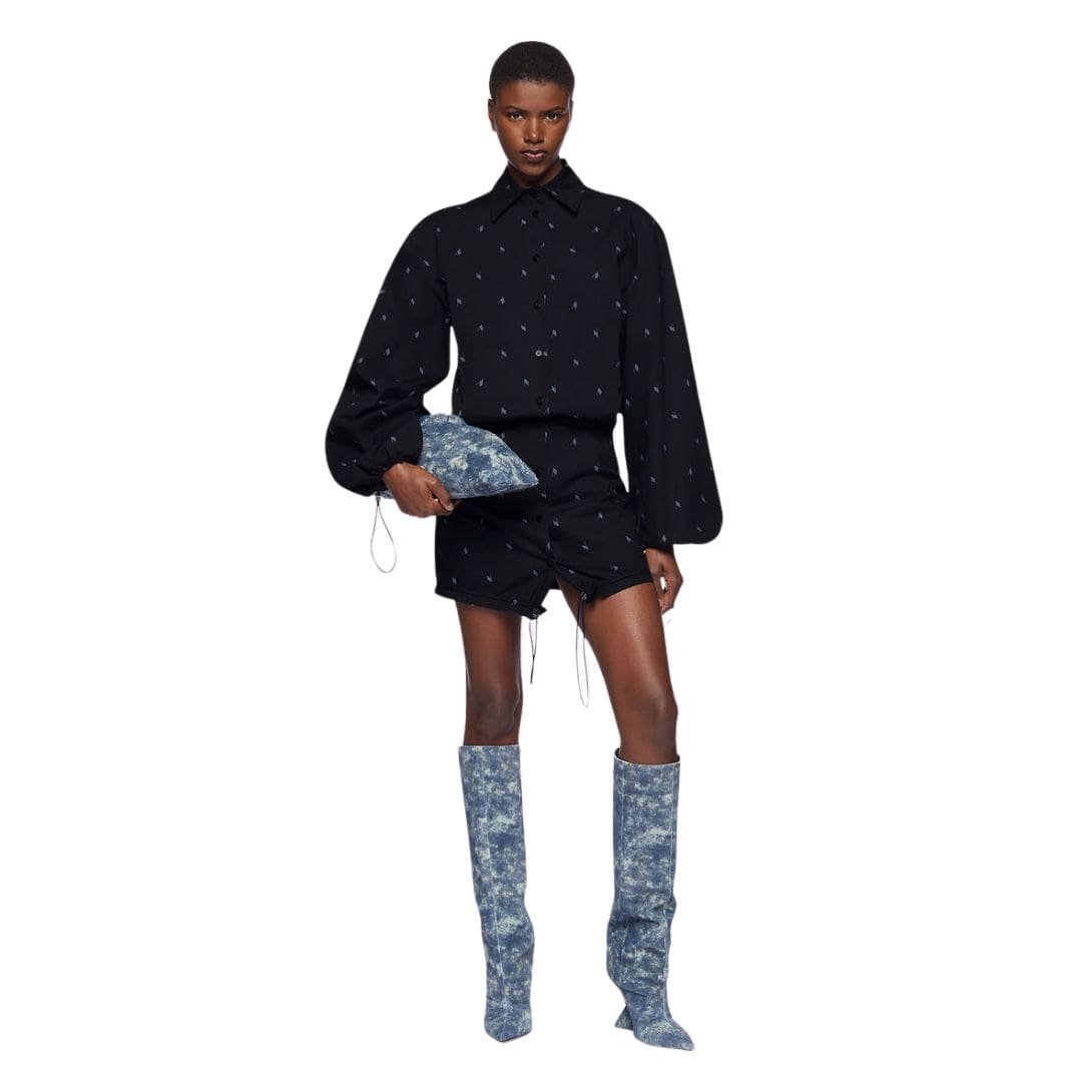 The attico navy blue and light blue mini dress, meticulously crafted in Italy, showcases navy blue and light blue logo printed poplin. It features a fitted basque, drawstring detail, and logo metal stops for added flair.