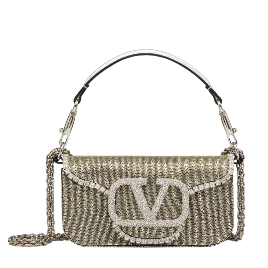 Introducing the Valentino Garavani Locò Embroidered small shoulder bag, adorned with leather embroidery and featuring the iconic VLogo Signature element embellished with Swarovski crystals.