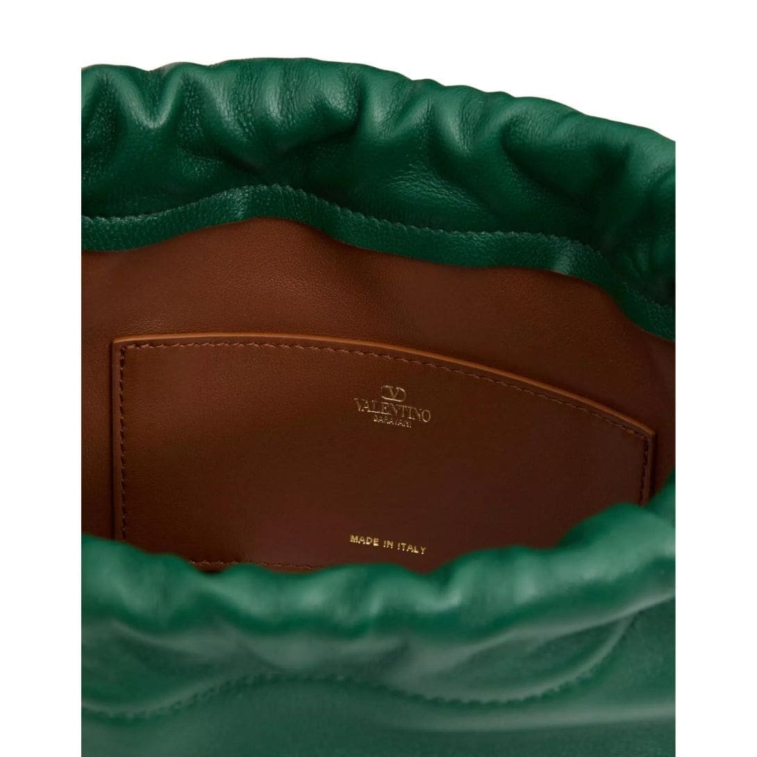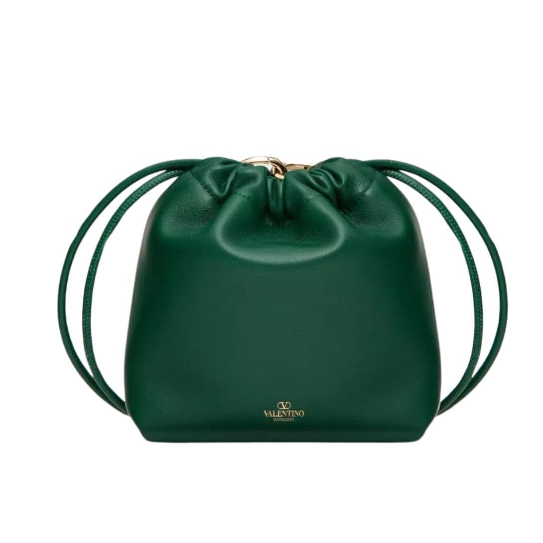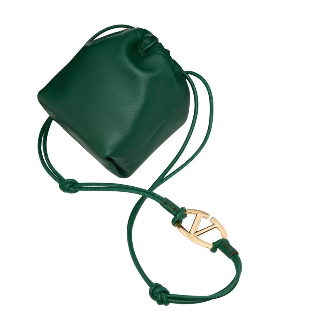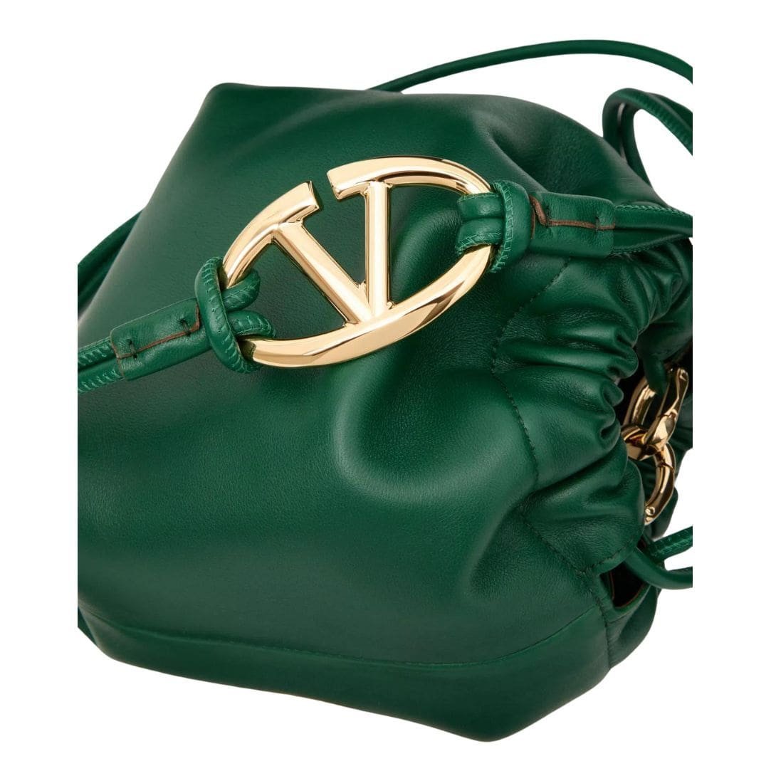 Introducing the Valentino Garavani Vlogo Pouf nappa leather mini bucket bag, crafted from luxurious nappa leather with a striking gold-tone Vlogo Signature element. This versatile bag can be worn on the shoulder/cross-body or carried by hand, thanks to the adjustable sliding shoulder strap.