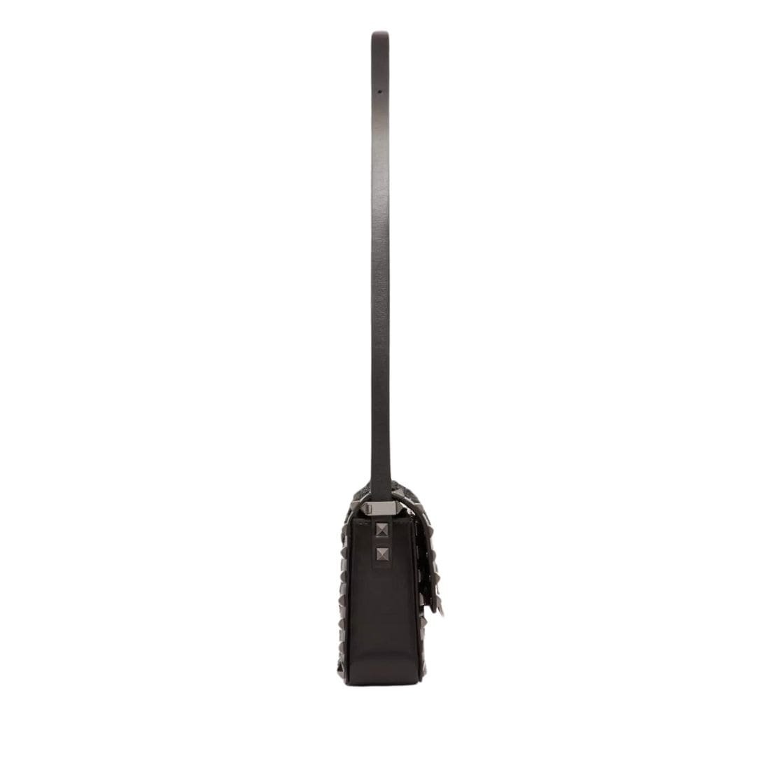 Introducing the valentino rockstud23 e/w tweed shoulder bag, featuring tweed embellished with micro sequins and adorned with tone-on-tone stud trim. This stylish bag offers versatility for shoulder or crossbody wear, thanks to its adjustable shoulder strap. The ruthenium-finish hardware adds a modern touch, complementing the iconic hook closure for security. Inside, discover the luxurious nappa leather lining and a slip pocket for organization.