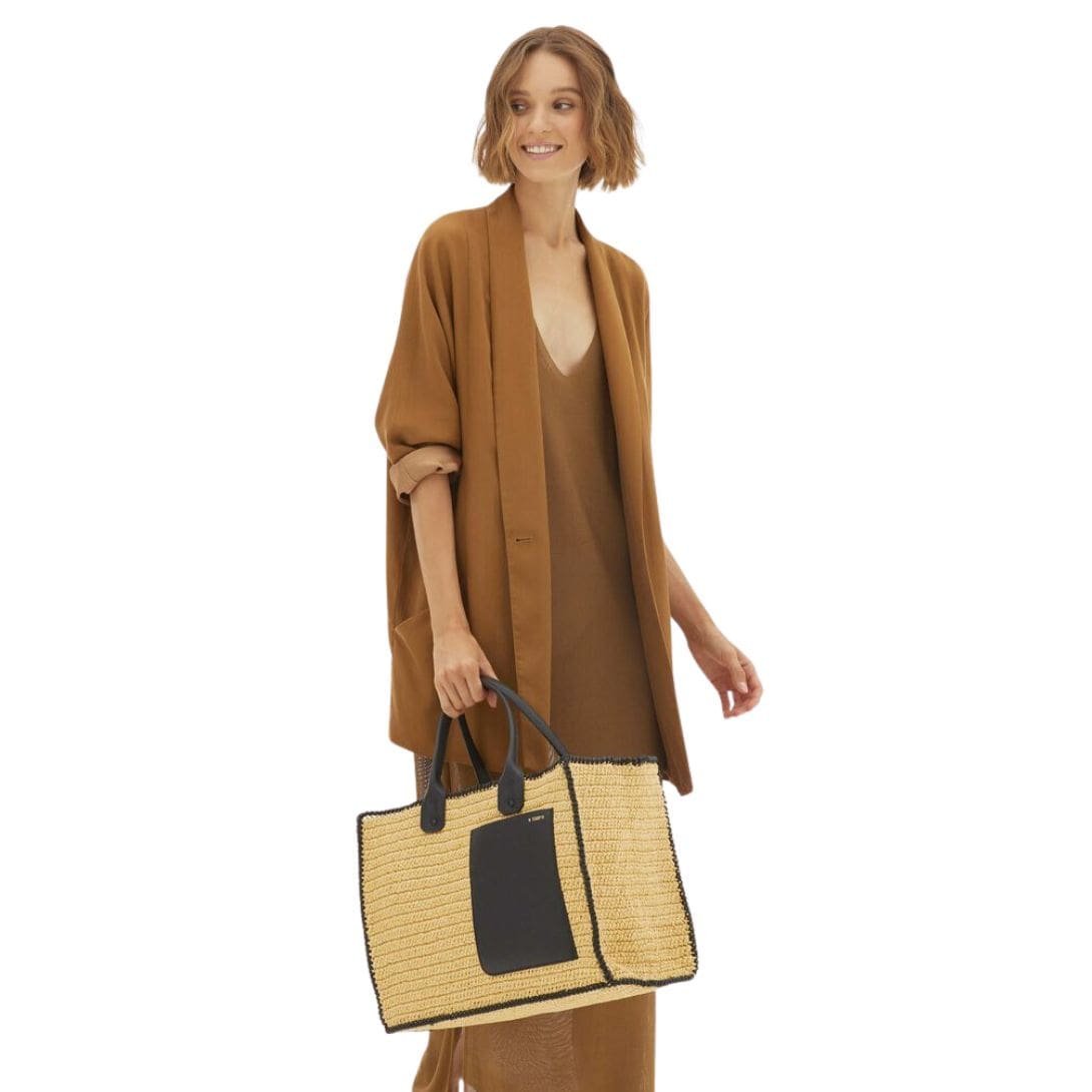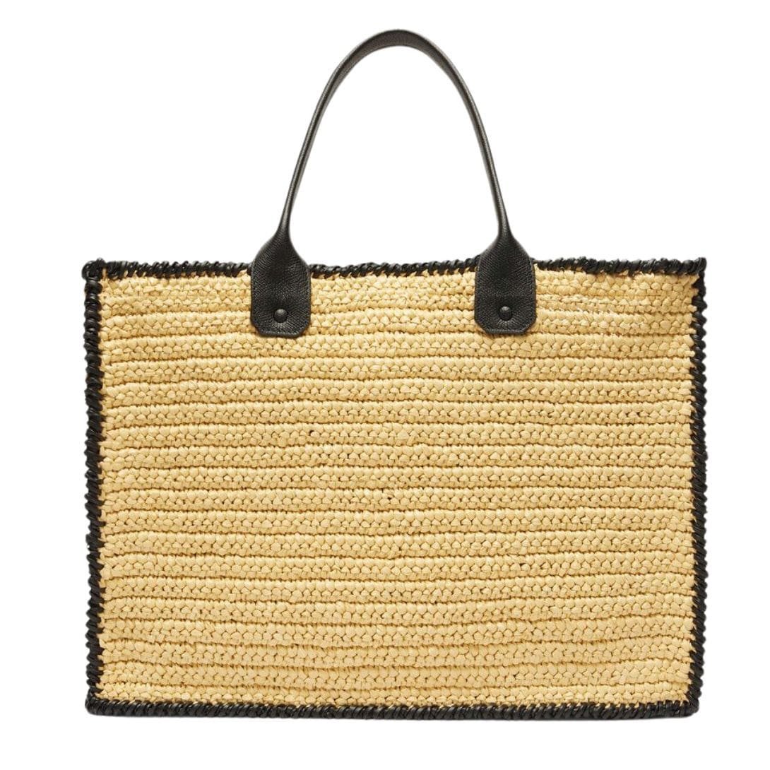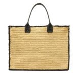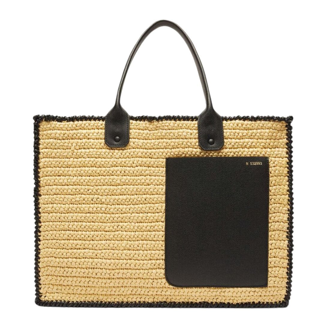 The structured valextra Soft Tote Raffia crochet large bag combines hand-crocheted raffia with our signature Millepunte calfskin, resulting in a uniquely artisanal carryall. Accented with black calfskin to echo our iconic black lacquered Costa lines, this spacious weekend and vacation bag pays homage to the architectural silhouette of our beloved Milan. Its interior features a detachable zipped pouch for versatility, while the external pocket showcases our signature embossed foiled code, symbolizing its exceptional quality and origin.