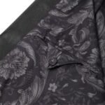 The design features classic biker jacket elements infused with Versace’s signature aesthetic. Asymmetric zippered closures lend an edgy vibe, while intricate stitching and paneling create a sense of dynamic movement. The iconic Versace Greek key motif subtly embellishes the collar and cuffs, elevating the jacket to an unmistakable status symbol.